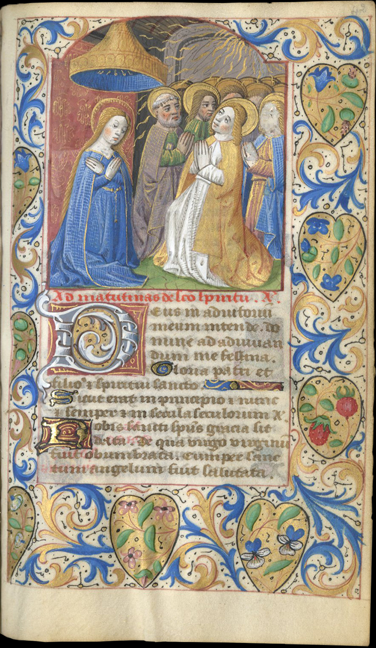 This Book of Hours was first illuminated in Paris by the Master of Robert Gaguin, active in Paris from c. 1480 to c. 1500. Alongside the four other miniatures, the Annunciation constitutes a fine example of his style, favoring short figures with pale, porcelain-like flesh tones, square-shaped faces with prominent cheekbones, slim nose and eyebrows, and bell-shaped blond hair, as well as a palette of light blue and gold. Also distinctive is the subtle modelling of the faces in thin hatchings of red on the cheeks, red lips, soft shades, which convey a soft, almost dusty finish to the miniature. As in most of his manuscripts, settings are comprehensively evoked, whether interiors framed with openwork arches and filled with minute architectural detail and furnishings, or landscapes developed with a convincing sense of depth. These miniatures rely on models still indebted to Master François alongside whom he trained, which may argue for an early date. Although the setting and figures of the Annunciation are similar to a Primer illuminated by the Master of Robert Gaguin for Geoffroy de La Croix around 1495 (Paris, BnF, MS , ff. 189v, 238), the Pentecost and Office of the Dead miniature thus compare to models also found in contemporary Books of Hours from the workshop of François II Le Barbier (see e.g. Oxford, Bodleian Library, MS Canon Liturg. 43; Paris, BnF, MSS lat. 1406, and lat. 1415).