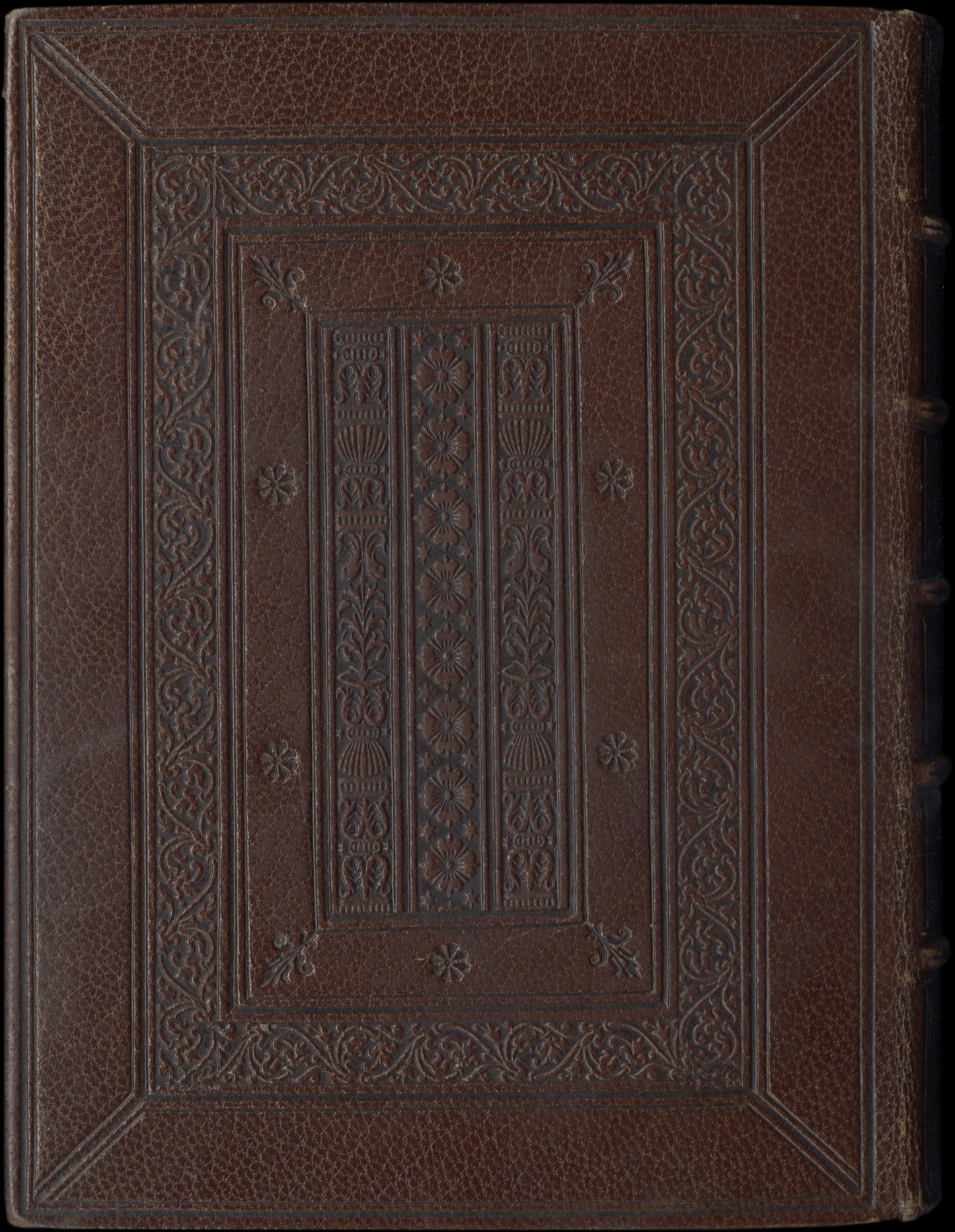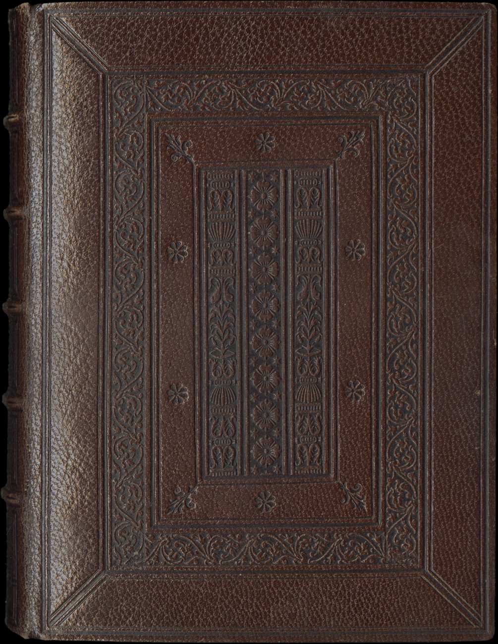 ii (paper) + 153 + ii (modern parchment) + ii (paper) folios on parchment, missing one leaf with a miniature at the beginning of Terce of the Hours of the Virgin (before fol. 45), else complete (collation: i8, ii10, iii-v8, vi7 (of 8, lacking iii), vii8, viii10, ix-xviii8, xix6 (of 8, with last 2 leaves of quire cancelled)), catchwords for all quires, except for three quires (1, 2 and 18), text written in a formal gothic bookhand in brown ink on 18 long lines, ruled in red (written space: 59 x 81-85 mm), rubrics in red, text capitals touched in yellow, line-endings alternately in red and blue, decorated with brushed gold, one-line initials in burnished gold against blue or red grounds, two-line high initials in burnished gold against a ground of blue or red with white penwork decoration, except for ff. 143-152, where 2-line high initials are alternately in white and gray against a ground of brushed gold, or in brushed gold against a ground of red with gold penwork decoration, 5-line high initials below miniatures on ff. 42, 48 and 50 in brushed gold or silver (now oxidized) with infill of painted flowers, remainder of 5-line high initials in red or blue highlighted in white tracery decoration against burnished gold grounds with infill of colored ivy leaves, 2 HISTORIATED INITIALS, one accompanied by a decorative staff (f. 116), the other historiated initial echoed by A SMALL MINIATURE set of to the right and flanked with a panel border of colored acanthus leaves and flowers against a burnished gold ground with in the center a branch with belt and coat of arms (“azure a bend dancetty or”) (f. 144), 4 SMALL MINIATURES set in rectangular illuminated frames of flowers, fruits and colored ivy leaves on burnished gold grounds, 13 LARGE MINIATURES set in decorated rectangular frames alternately of colored acanthus leaves, naturalistic flowers and fruits or ivy leaves, including four accompanied with full illuminated historiated borders containing accessory scenes (ff. 28, 68, 76, 92), text a little rubbed in places, overall in good condition, miniatures brilliantly preserved. Bound in a late-nineteenth or early-twentieth imitation binding of blind-tooled brown morocco, back sewn on five thongs, inner pastedowns and recto of first flyleaves lined with maroon silk, edges gilt, manuscript placed in a red silk wraparound fitted in a dark red morocco slipcase. Dimensions 152 by 113 mm.