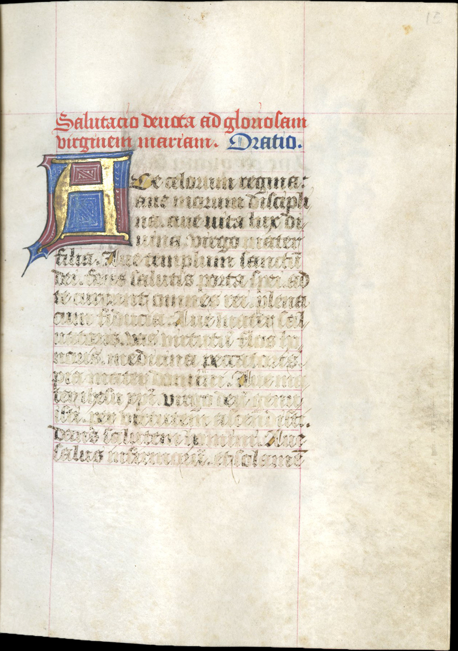 ff. 13-13v, Prayer, rubric, Salutacio devota ad gloriosam virginem mariam; incipit, “Ave celorum regina”;