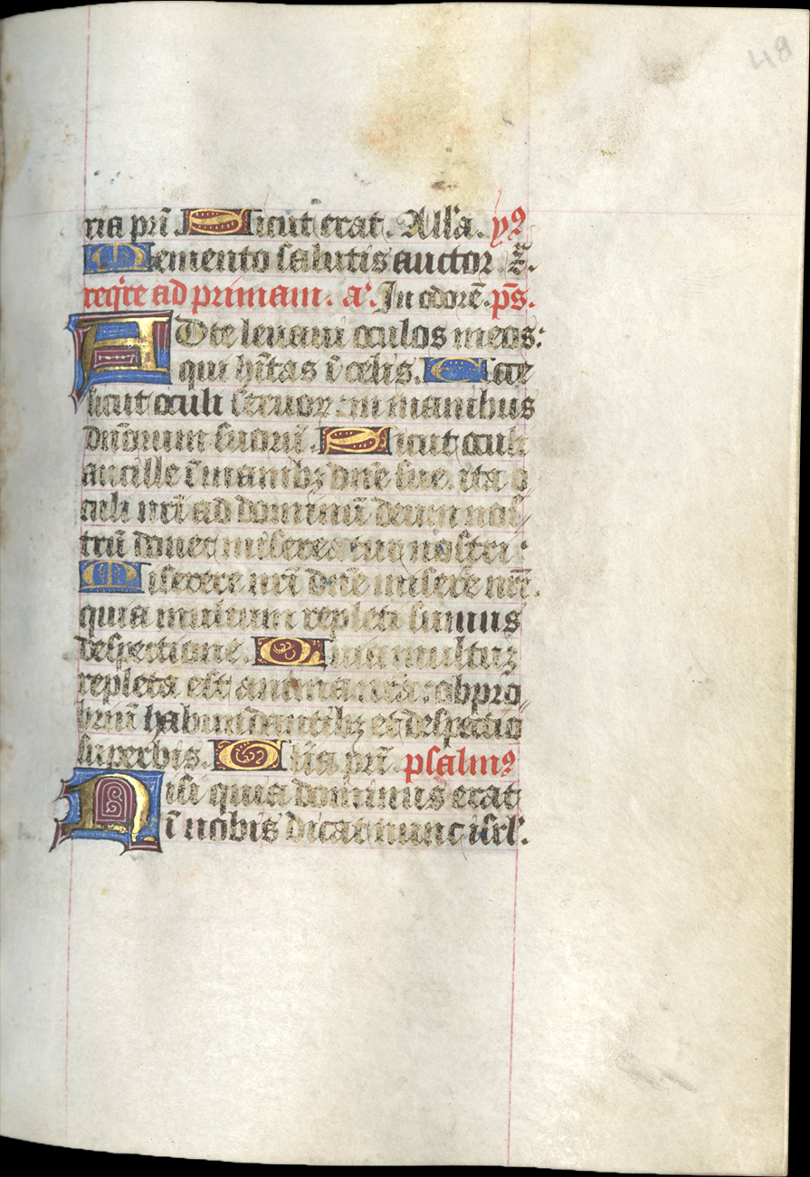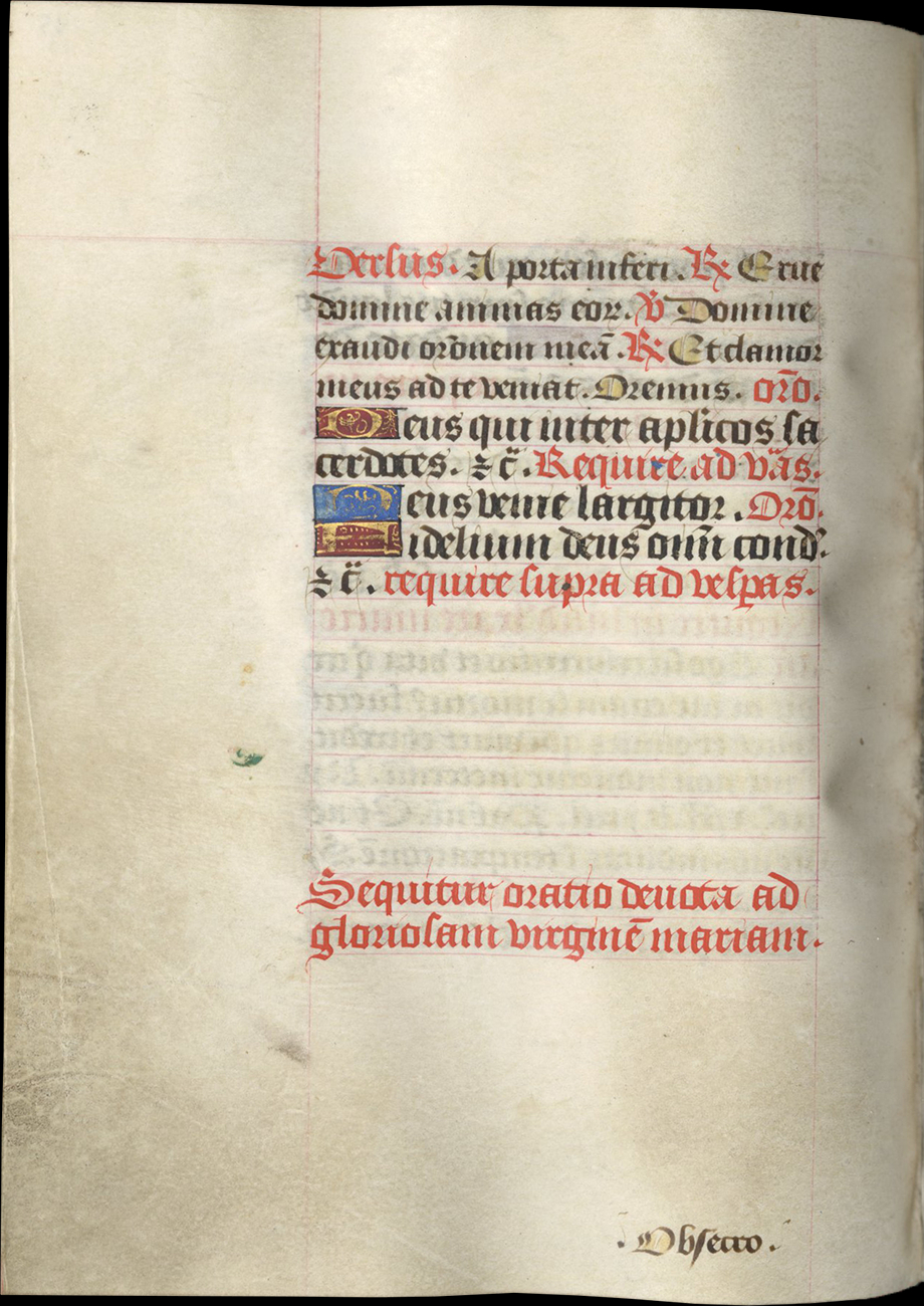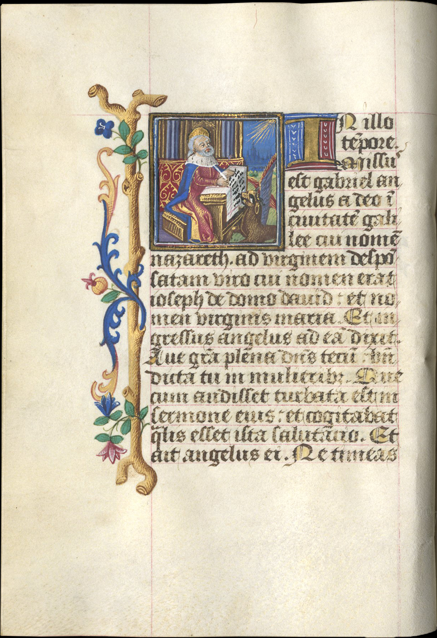ff. 18-66v, Hours of the Virgin, use of Rome, with Matins (f. 18), Lauds (f. 33), Prime (f. 42), [lacking Terce], Sext (f. 48), None (f. 50), Vespers (f. 53), Compline (f. 57);
