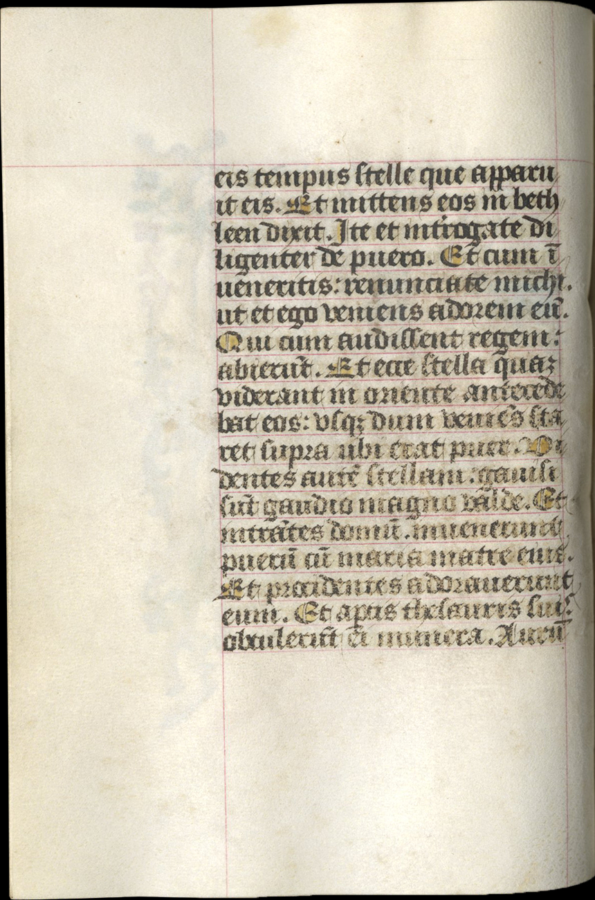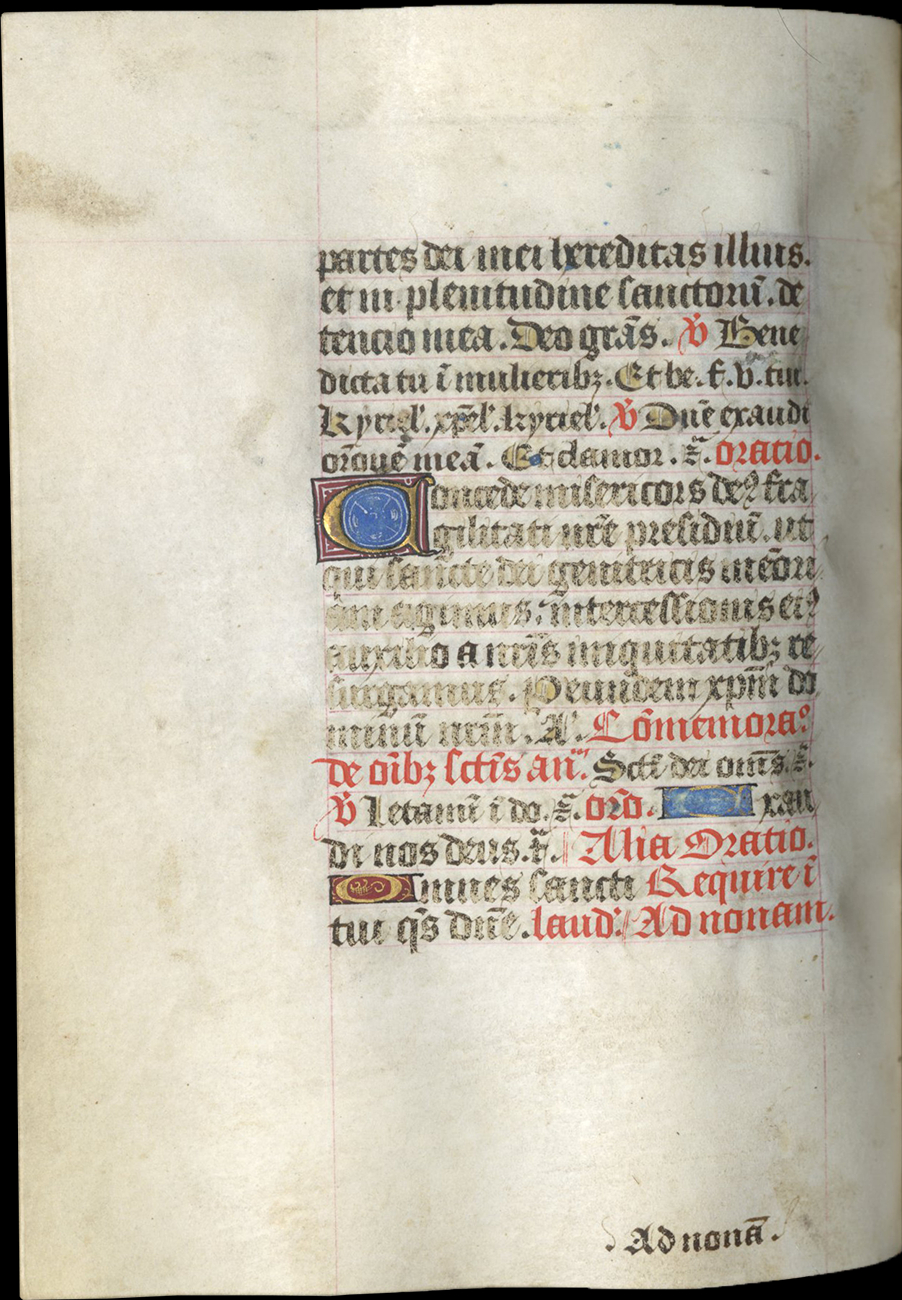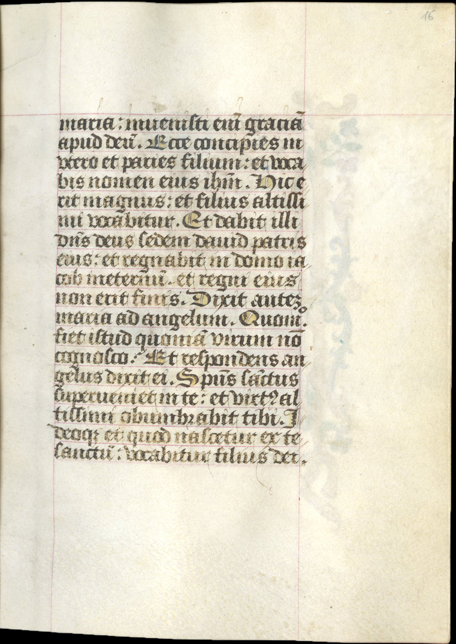 ff. 18-66v, Hours of the Virgin, use of Rome, with Matins (f. 18), Lauds (f. 33), Prime (f. 42), [lacking Terce], Sext (f. 48), None (f. 50), Vespers (f. 53), Compline (f. 57);