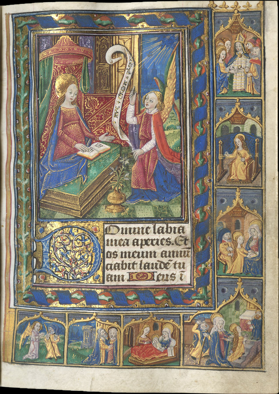 f. 18, Annunciation, with marginal scenes in architectural frames (reading from bottom left to top right) of the Annunciation to Joachim, the Meeting at the Golden Gate, the Birth of the Virgin, the Presentation of the Virgin in the Temple, the Holy Family, the Virgin spinning, and the Marriage of the Virgin;