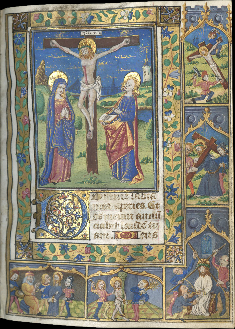 f. 67, Crucifixion, with scenes in the margin from the bottom left to top right of the border of the Mocking of Christ, the Flagellation, the Crowning with Thorns, the Carrying of the Cross, and the Nailing of Christ to the Cross;