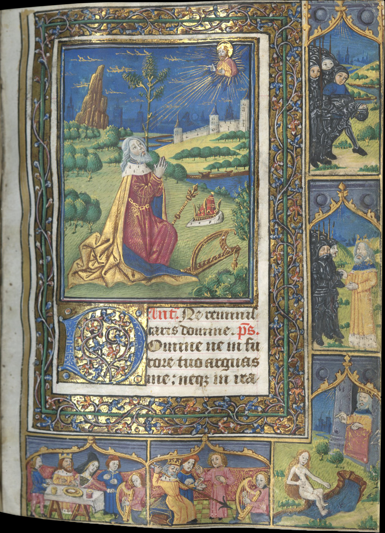 f. 76, King David Praying to God, with scenes in the margin from the bottom left to the top right of David playing his harp before Saul, David watching Bathsheba bathing, David giving orders to Uriah's captain, and Uriah slain (?);