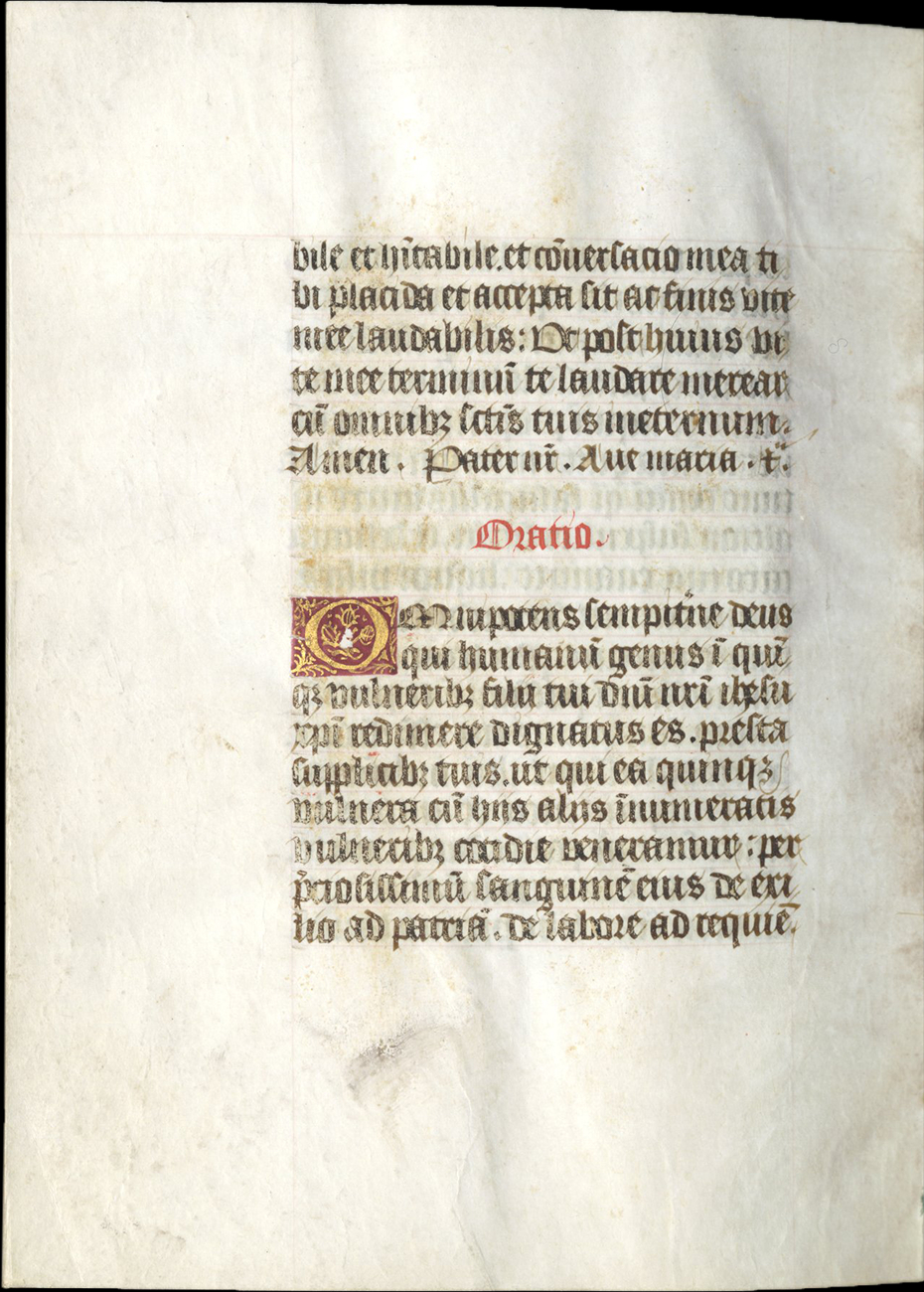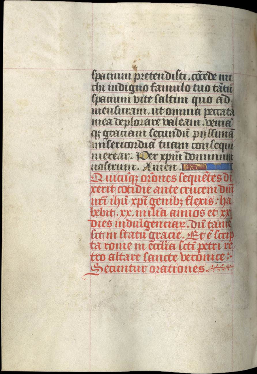 ff. 143-144, Gregory on the Five Wounds of Christ (Papal indulgences), rubric, "Sanctus Gregorius dum esset summus pontifex et missam celebraret... Incipit prima oratio"; incipit, “Ave dextera manus Christi...”;