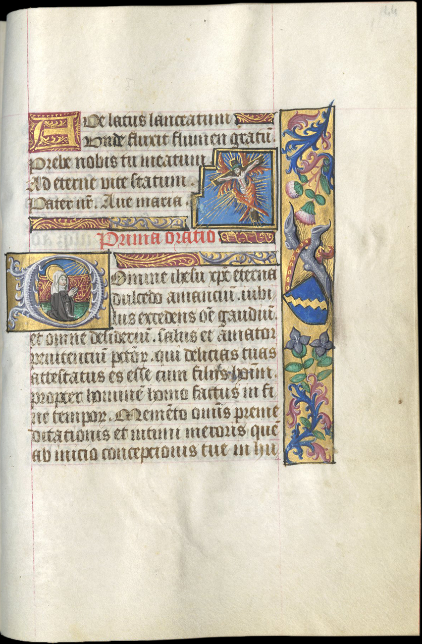 The arms that occur next to a miniature of St. Bridget in prayer and below a miniature of Bridget’s view of the Crucifixion at the beginning of the Fifteen O’s of St. Brigit, Azure a bend dancetty or, are evidently those of the La Baume family. Originally from Bresse, this family was one of the most important families of Savoy. They counted among their members a marshal and an admiral of Savoy, a tutor of the count of Savoy, a vice-King of Naples, and so forth. The addition of the dancetty band to the shield was reserved for the branch of the La Baume family known as the Lords of Mont-Saint-Sorlin and Counts of Montrevel.