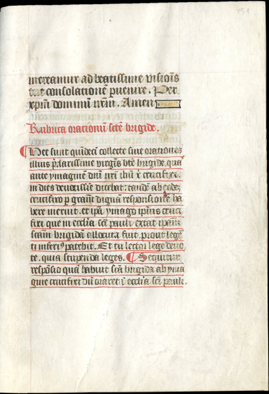 ff. 144-152v, The 15 “O’s” of Saint Bridget, rubric placed after the text, "Rubrica oracionum sancte brigide. Hec sunt quindecim collecte sive orations illius preclarissime virginis beate brigide...";
