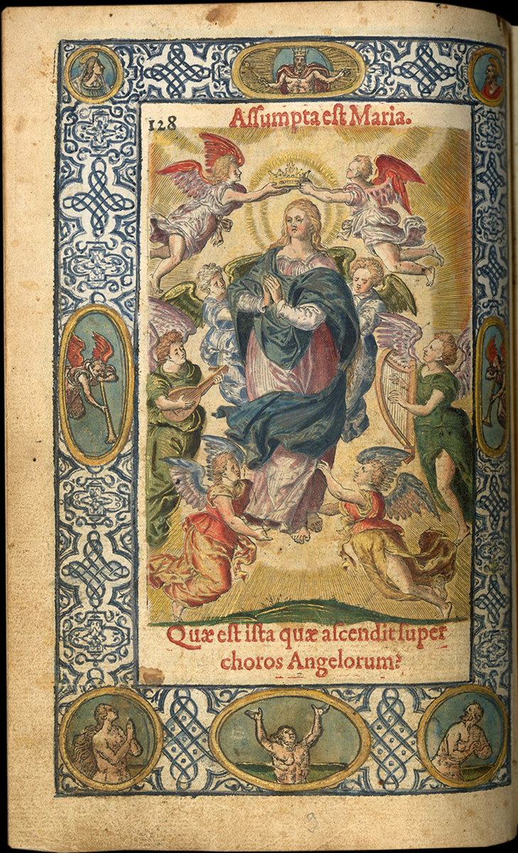 The volume is illustrated with fine hand-illuminated copper engravings by Jan Wierix (1549-1618), signed “IHW”, Peeter van der Borcht (c. 1535-1608), signed “PB” or “P” or “IP” (Bowen, “Wierix...”, p. 148), Abraham de Bruyn (c. 1538-1587?), signed “ADB”, and Pieter Huys (1519-1581?), signed “PH” or “P HVIIS.” In addition, every page is framed with one of sixteen different engraved borders, each with eight medallions depicting various religious symbols and scenes, and the busts of saints; these borders are also hand-illuminated.