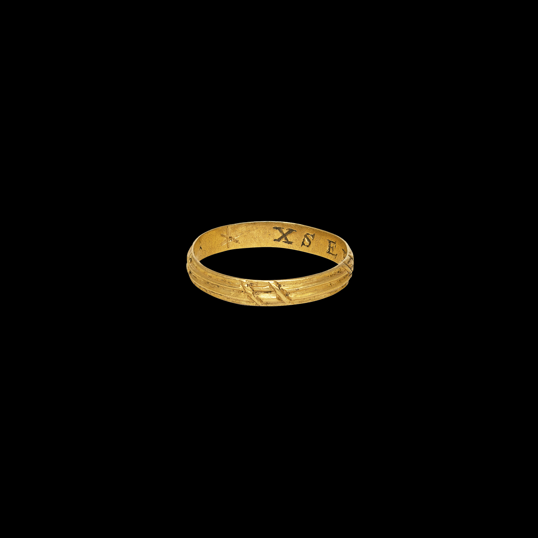 Gold band with D-section, fluted on the exterior with four diagonal ribbon-like bands and on the interior engraved with the inscription in Roman capitals: XSEPE x MI x GYFTE *. The ring shows signs of wear through age and is in good wearable condition.