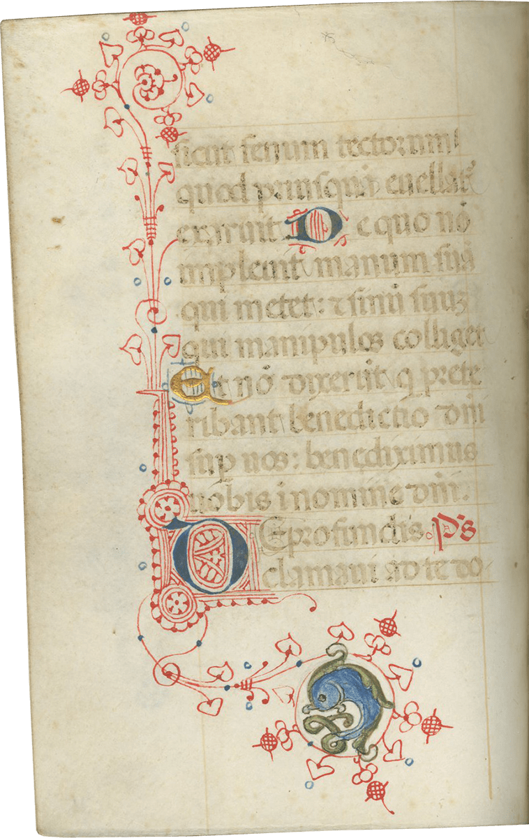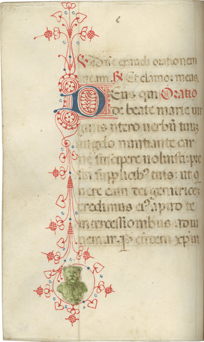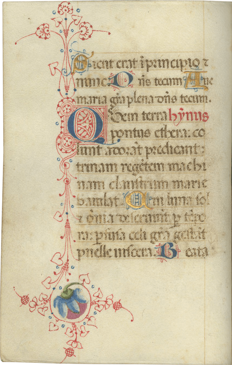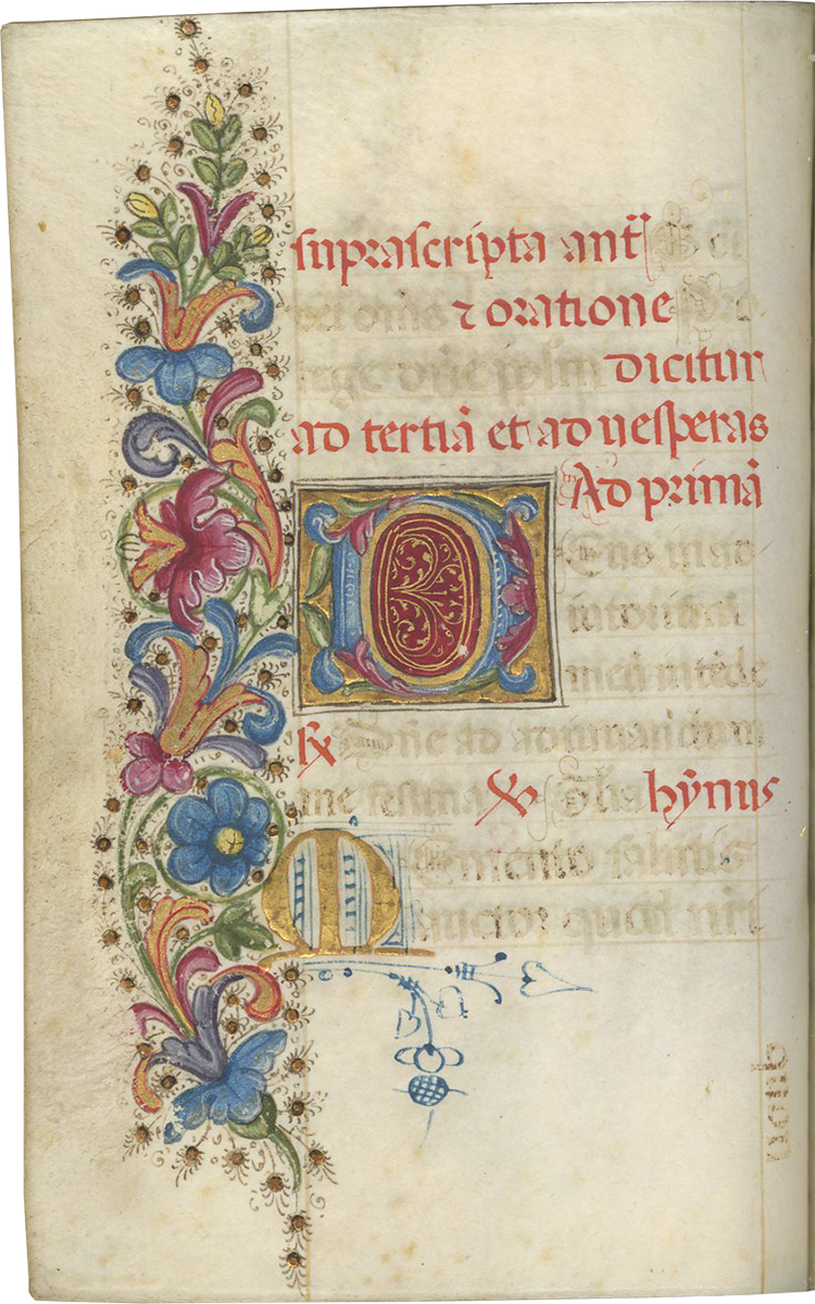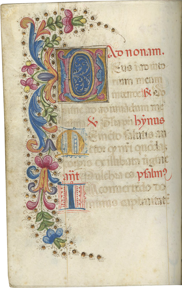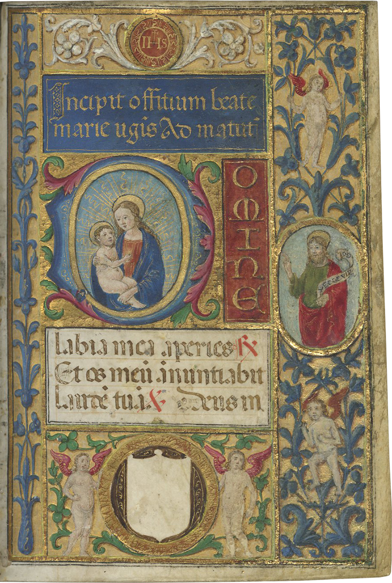 ii (paper) + 199 parchment + ii (paper), foliated in a nineteenth-century hand 1–199 in lower left margins, lacking one leaf after f. 132, else complete [collation: i10, ii8, iii10, iv10, v10, vi10, vii10, viii10, ix10, x10, xi4, xii10, xiii10, xiv10, xv10-1, xvi10, xvii10, xviii10, xix10, xx10, xxi8]; ruled in brown ink in a single column of twelve lines (justification: 41 × 63 mm); written in gothic rotunda minuscule; rubrics in red; versal initials alternately in dark blue and burnished gold; the calendar in brown, red, blue, and burnished gold; two-line initials alternately in blue and burnished gold throughout, with extensive pen decorations to margins terminating in vines and floral patterns, often embellished with animals, figures, and drolleries; TWENTY-FOUR ILLUMINATED INITIALS on gold ground with partial painted borders; THREE HISTORIATED INITIALS on gold ground with full or partial borders; ONE FULL-PAGE ILLUMINATION forming mise-en-page with full borders featuring acanthus, putti, sacred monograms, and saints in medallions; minor cockling to leaves and rubbing to text throughout, otherwise in good condition. Eighteenth-century gold-tooled red morocco binding with monogram and title “OFFICIA COD. MEMBR, SEC.” on the backstrip, hinges replaced, marbled paper pastedowns. Dimensions 76 × 110 mm.