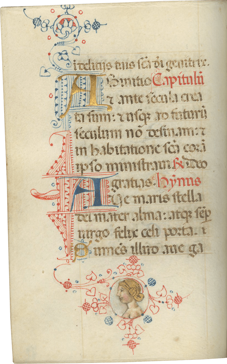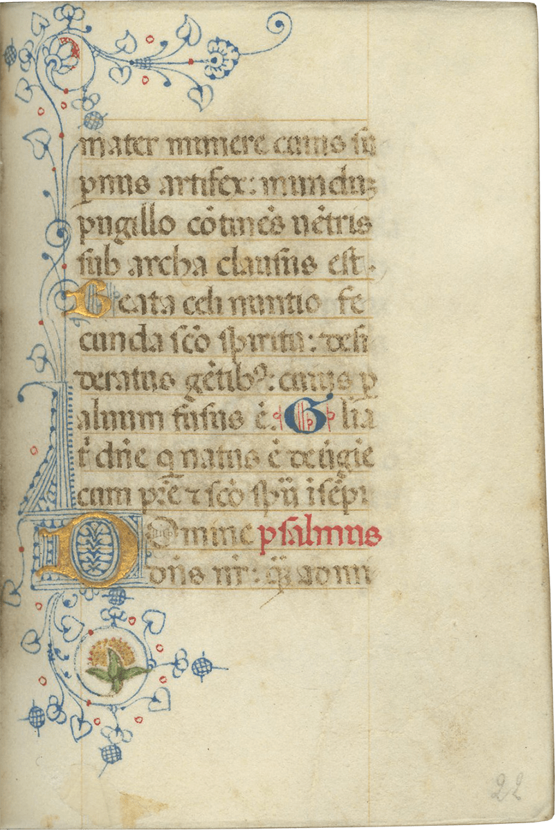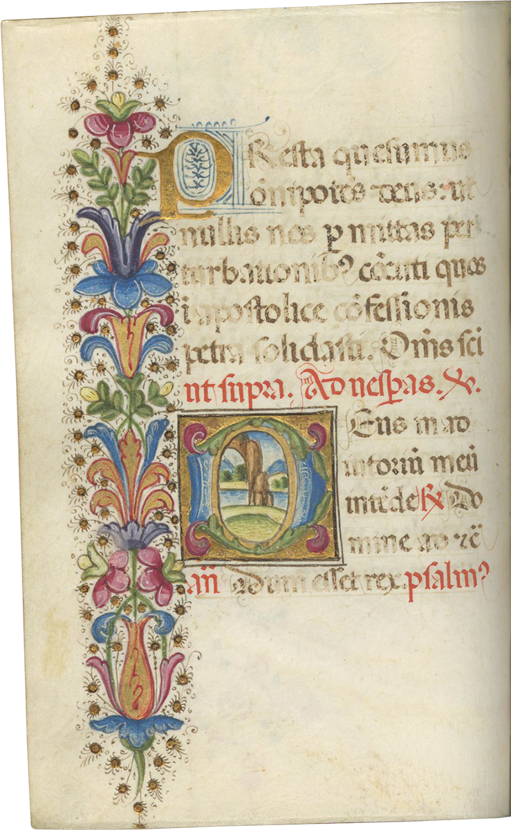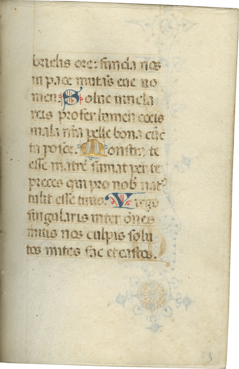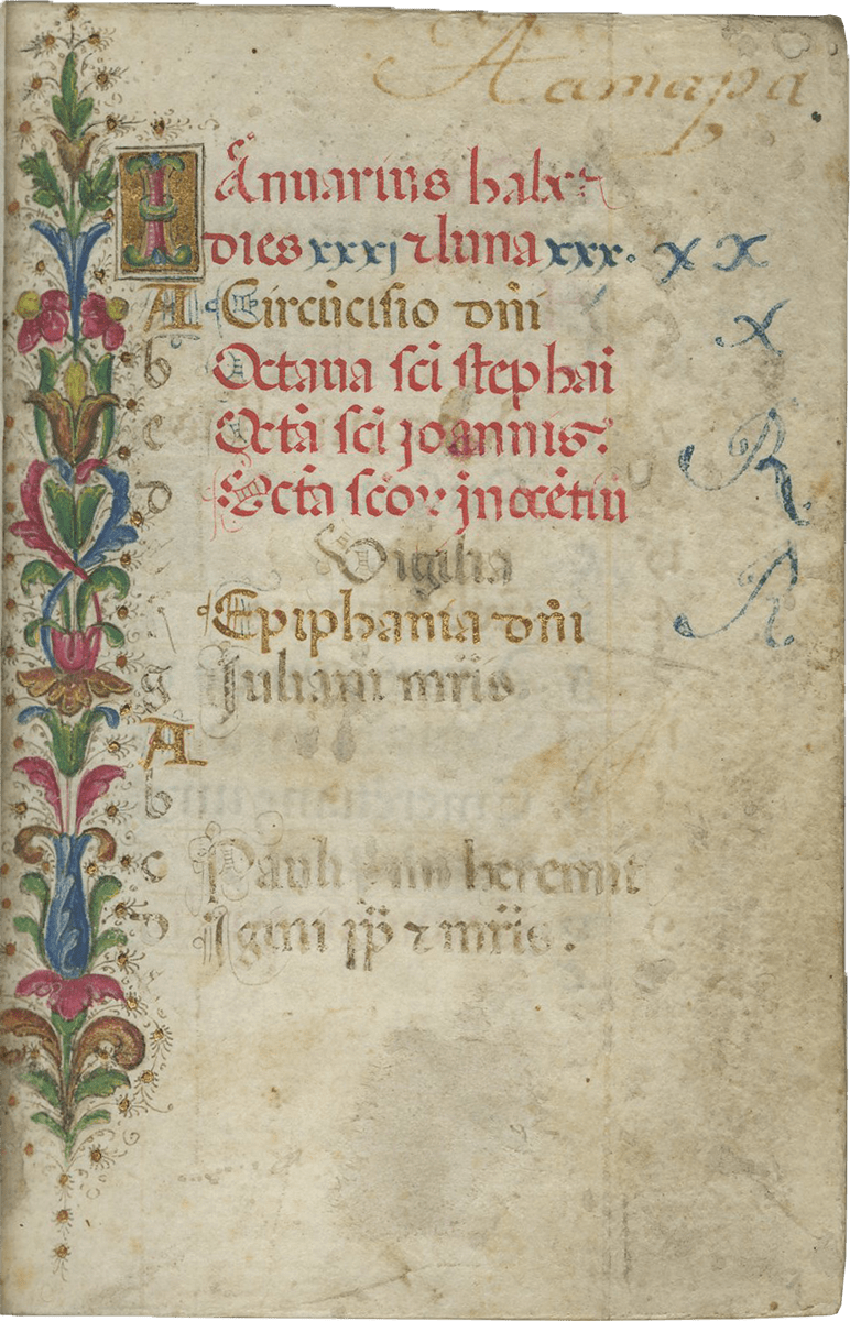 ii (paper) + 199 parchment + ii (paper), foliated in a nineteenth-century hand 1–199 in lower left margins, lacking one leaf after f. 132, else complete [collation: i10, ii8, iii10, iv10, v10, vi10, vii10, viii10, ix10, x10, xi4, xii10, xiii10, xiv10, xv10-1, xvi10, xvii10, xviii10, xix10, xx10, xxi8]; ruled in brown ink in a single column of twelve lines (justification: 41 × 63 mm); written in gothic rotunda minuscule; rubrics in red; versal initials alternately in dark blue and burnished gold; the calendar in brown, red, blue, and burnished gold; two-line initials alternately in blue and burnished gold throughout, with extensive pen decorations to margins terminating in vines and floral patterns, often embellished with animals, figures, and drolleries; TWENTY-FOUR ILLUMINATED INITIALS on gold ground with partial painted borders; THREE HISTORIATED INITIALS on gold ground with full or partial borders; ONE FULL-PAGE ILLUMINATION forming mise-en-page with full borders featuring acanthus, putti, sacred monograms, and saints in medallions; minor cockling to leaves and rubbing to text throughout, otherwise in good condition. Eighteenth-century gold-tooled red morocco binding with monogram and title “OFFICIA COD. MEMBR, SEC.” on the backstrip, hinges replaced, marbled paper pastedowns. Dimensions 76 × 110 mm.