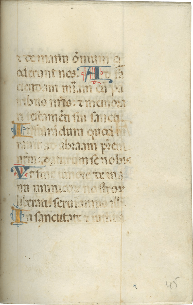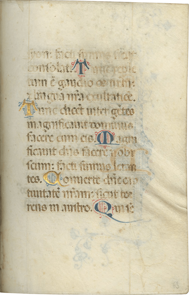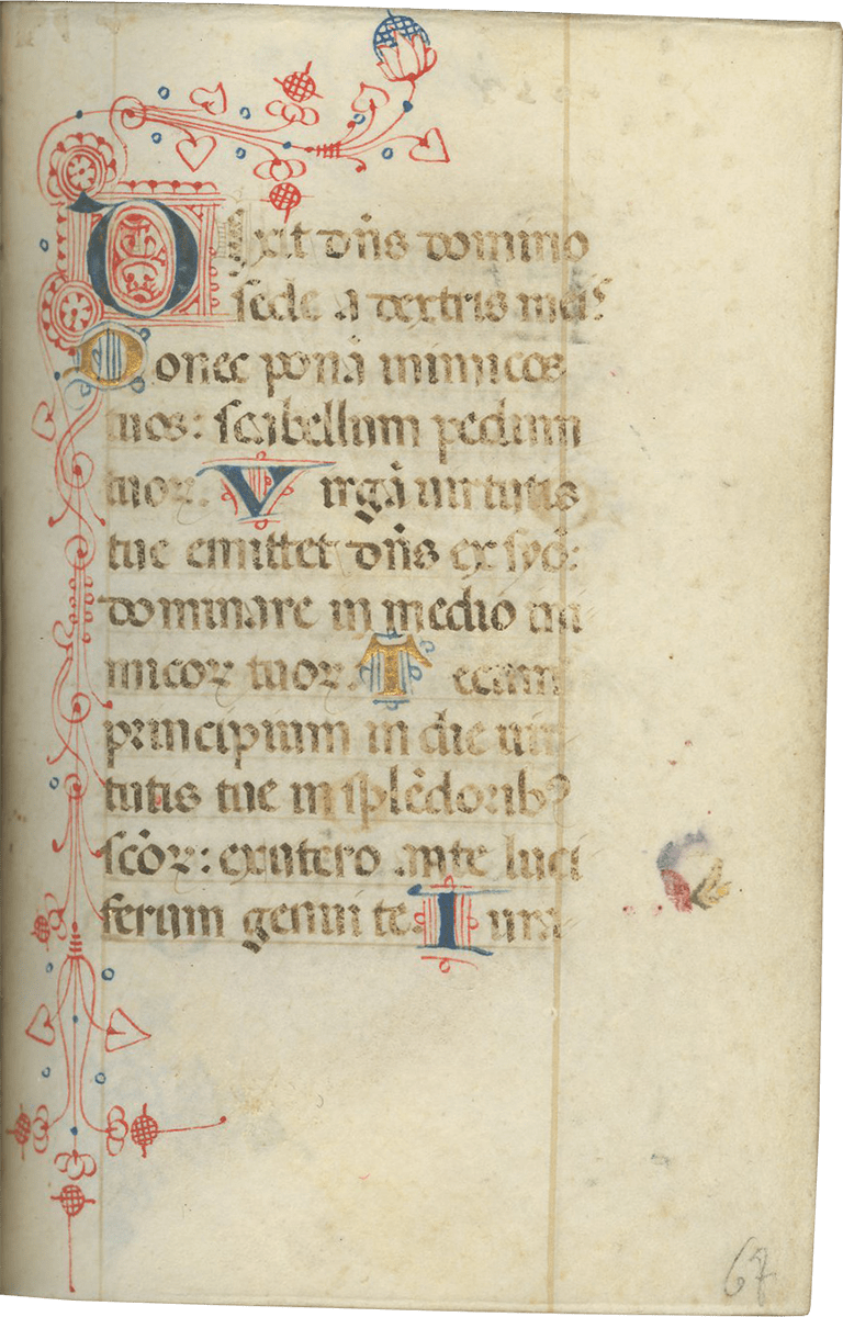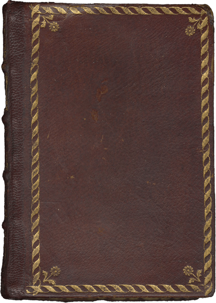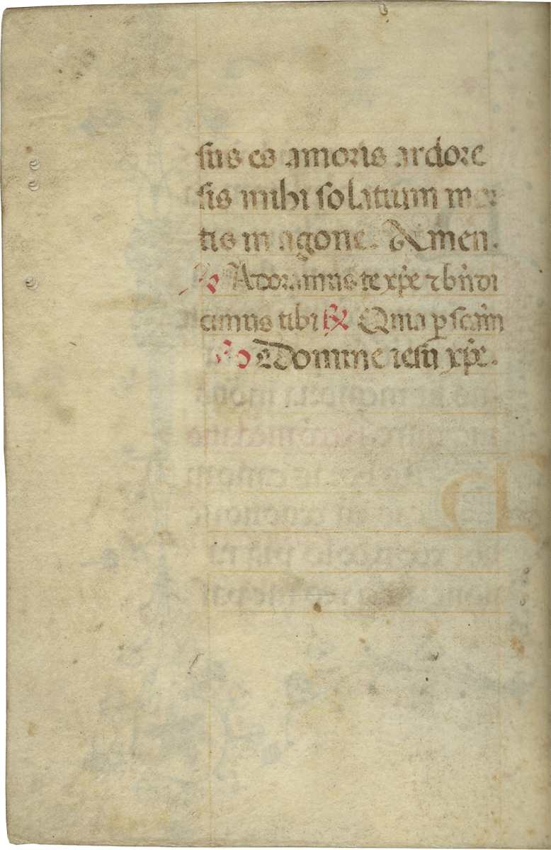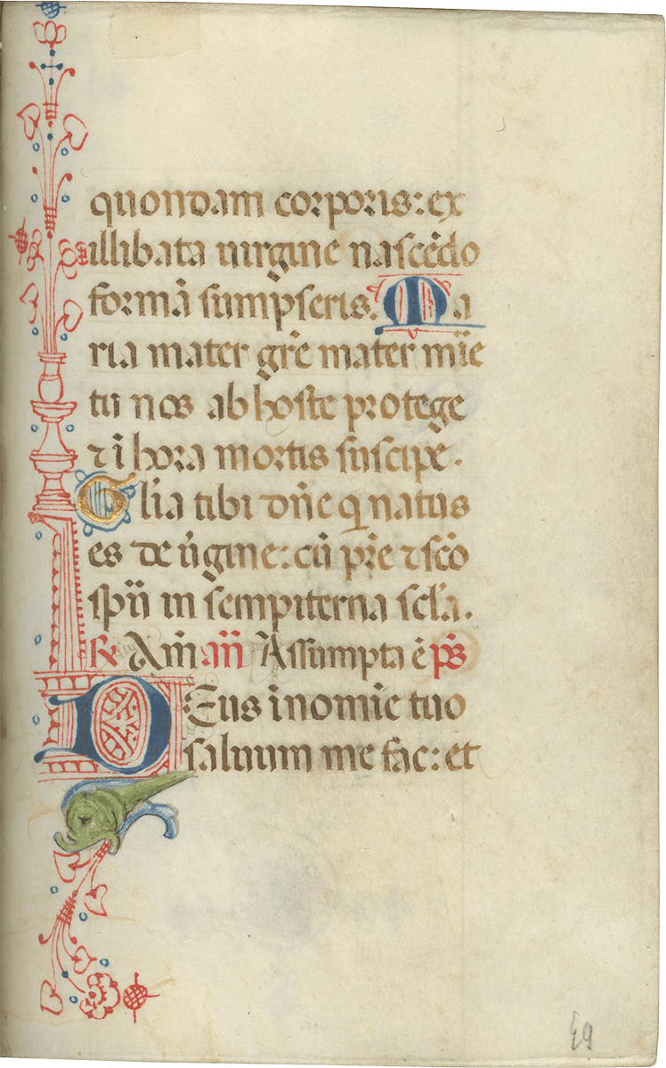 ii (paper) + 199 parchment + ii (paper), foliated in a nineteenth-century hand 1–199 in lower left margins, lacking one leaf after f. 132, else complete [collation: i10, ii8, iii10, iv10, v10, vi10, vii10, viii10, ix10, x10, xi4, xii10, xiii10, xiv10, xv10-1, xvi10, xvii10, xviii10, xix10, xx10, xxi8]; ruled in brown ink in a single column of twelve lines (justification: 41 × 63 mm); written in gothic rotunda minuscule; rubrics in red; versal initials alternately in dark blue and burnished gold; the calendar in brown, red, blue, and burnished gold; two-line initials alternately in blue and burnished gold throughout, with extensive pen decorations to margins terminating in vines and floral patterns, often embellished with animals, figures, and drolleries; TWENTY-FOUR ILLUMINATED INITIALS on gold ground with partial painted borders; THREE HISTORIATED INITIALS on gold ground with full or partial borders; ONE FULL-PAGE ILLUMINATION forming mise-en-page with full borders featuring acanthus, putti, sacred monograms, and saints in medallions; minor cockling to leaves and rubbing to text throughout, otherwise in good condition. Eighteenth-century gold-tooled red morocco binding with monogram and title “OFFICIA COD. MEMBR, SEC.” on the backstrip, hinges replaced, marbled paper pastedowns. Dimensions 76 × 110 mm.
