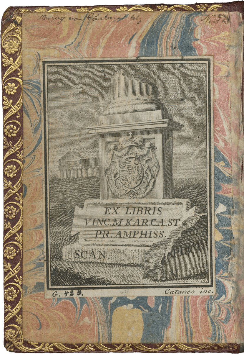 2. Vincenzo Maria Carlo Carafa della Stadera (1734–1765), Duke of Maddaloni, of the important Carafa family of Naples; his bookplate on front pastedown.