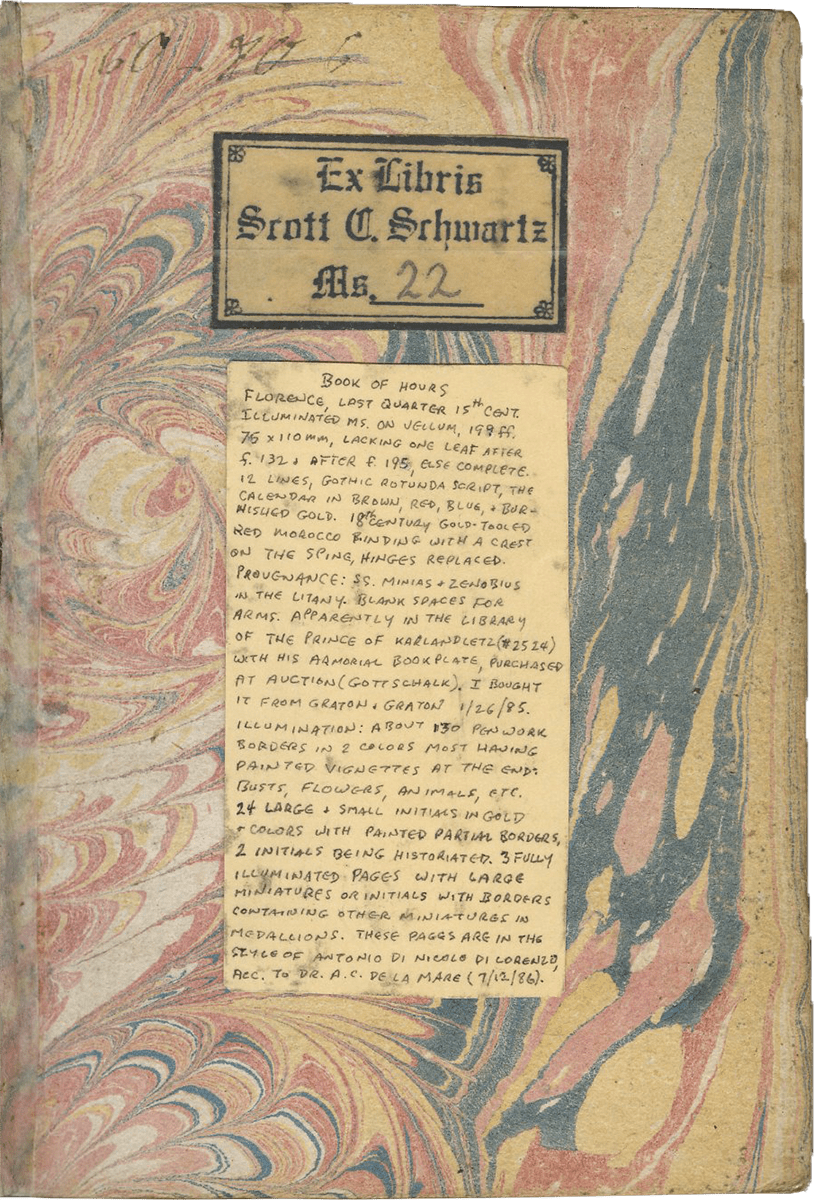 6. Dr. Scott Schwarz, New York; his bookplate with inventory number “MS 22” on the recto of the first flyleaf.