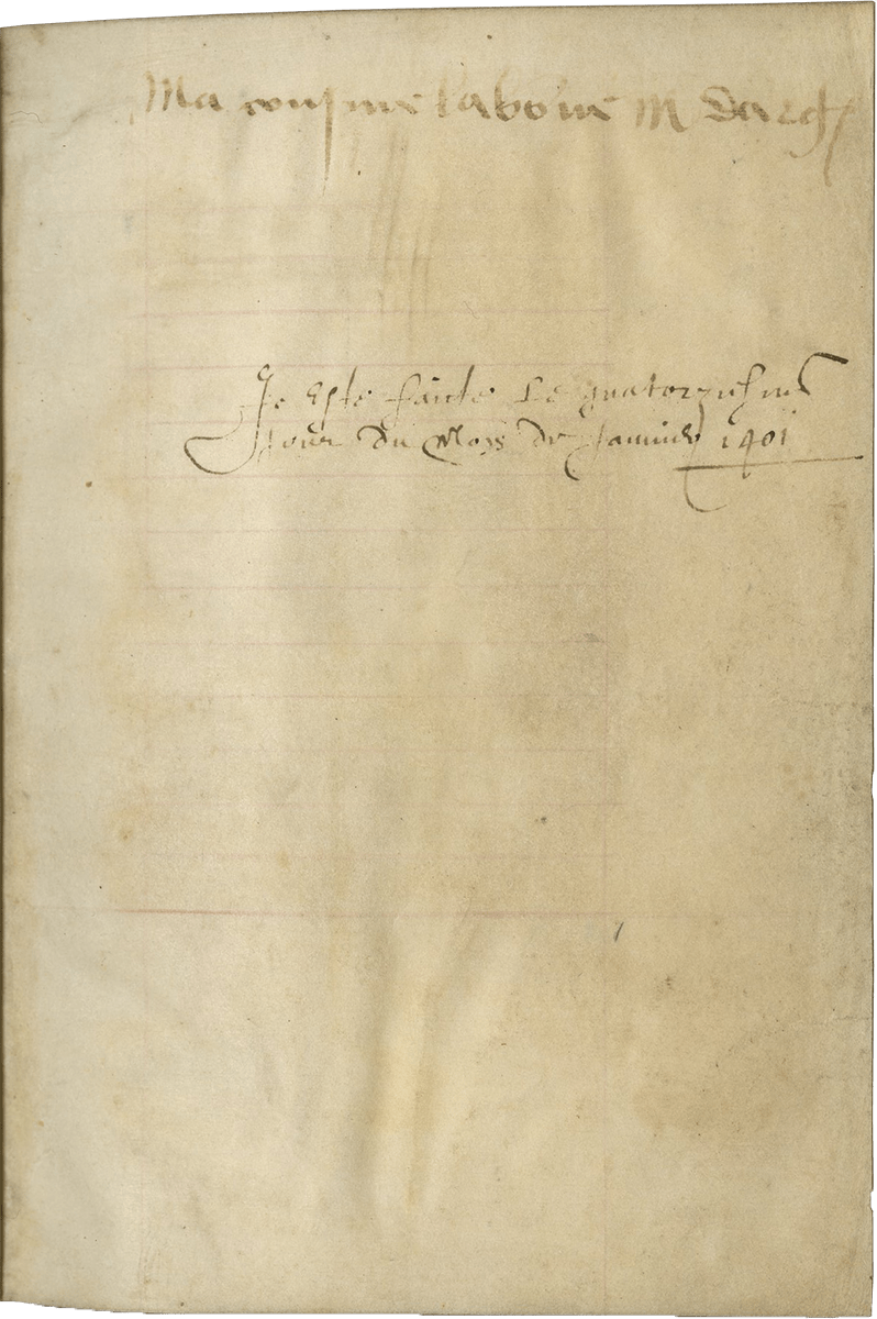 2. Inscription on fol. 1 recto: “Ma cousine la bonne M. d’Arg….” Unidentified provenance: this inscription is copied by an early sixteenth-century hand.