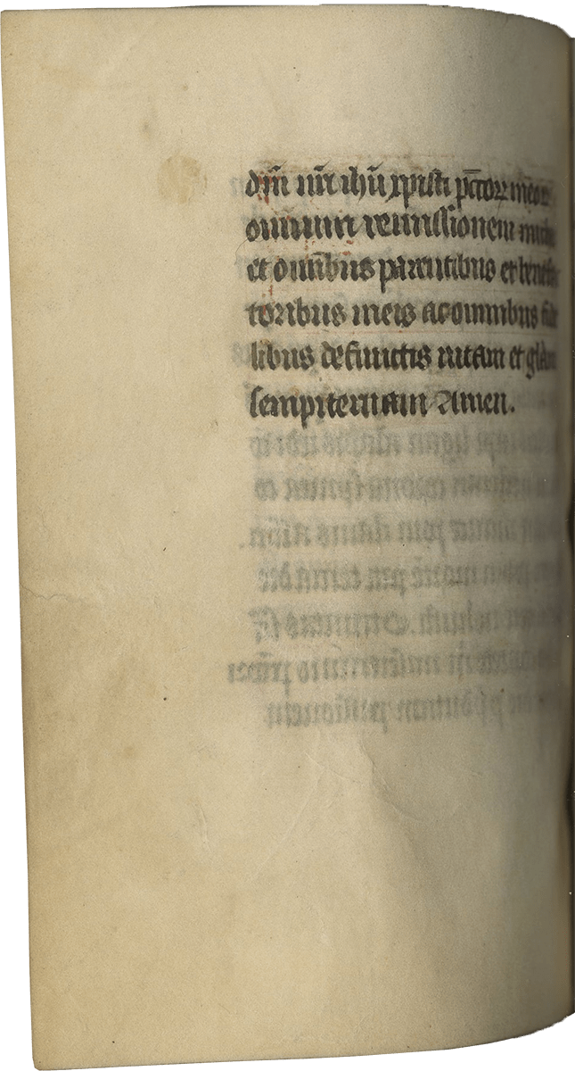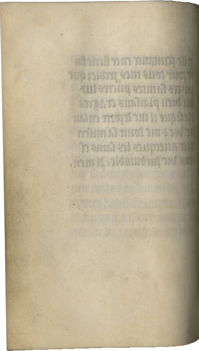 ff. 109v-111v, Indulgences granted by Pope John XXII; followed by Indulgences granted by Pope Bonifacius VI; rubrics in red: Jehan pape .xxii. octroye a tous ceulx qui en lisant en la messe diront ceste oroison .xxx. mille ans de pardon .x. mille pour pechés veniaulx et .xx. mille pour pechez morteulx; Papa Bonifacius sextus ad peticionem Philippi regi francie dedit omnibus dicentibus hanc orationem sequentem inter elevationem corporis et sanguinis domini nostri ihesu christi…duo millia annorum indulgenciarum. (Nota bene: there is a change of hand for these leaves, still a fifteenth-century hand but later than the core of the manuscript, as there were likely a few blank leaves at the end of the quire and a later owner added the indulgences to his codex);
