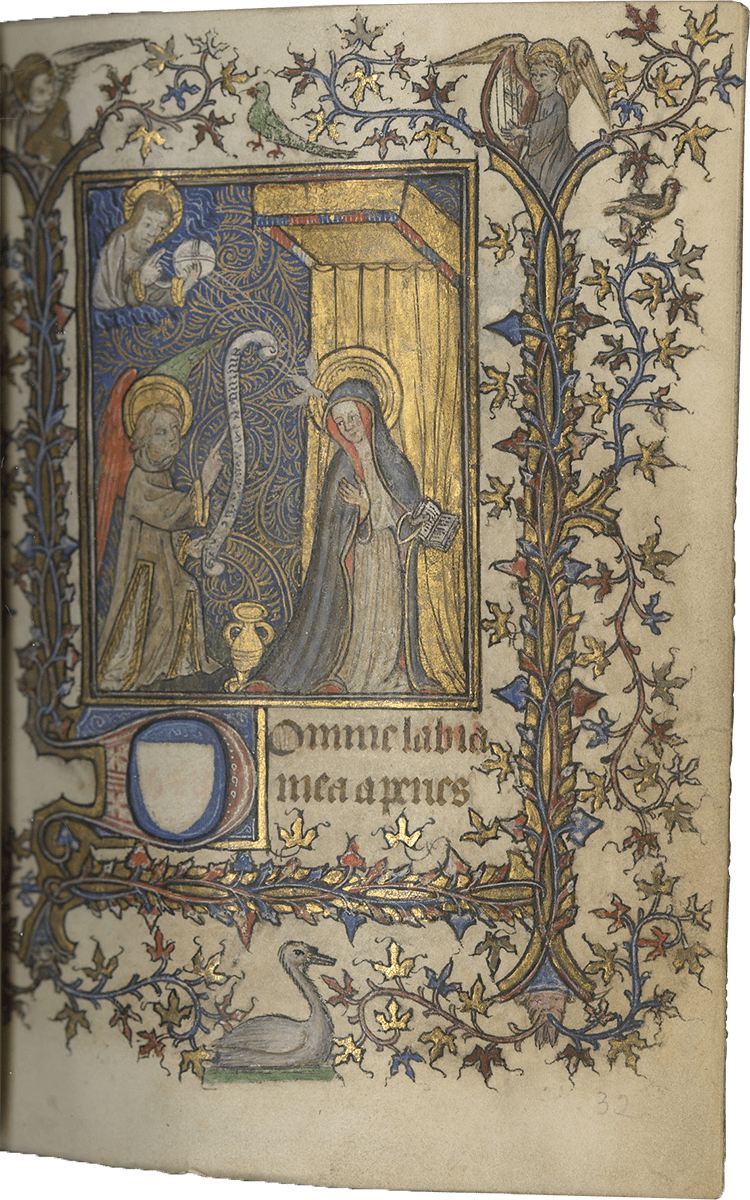 f. 32, Annunciation (large miniature, dimensions: 50 x 68 mm);