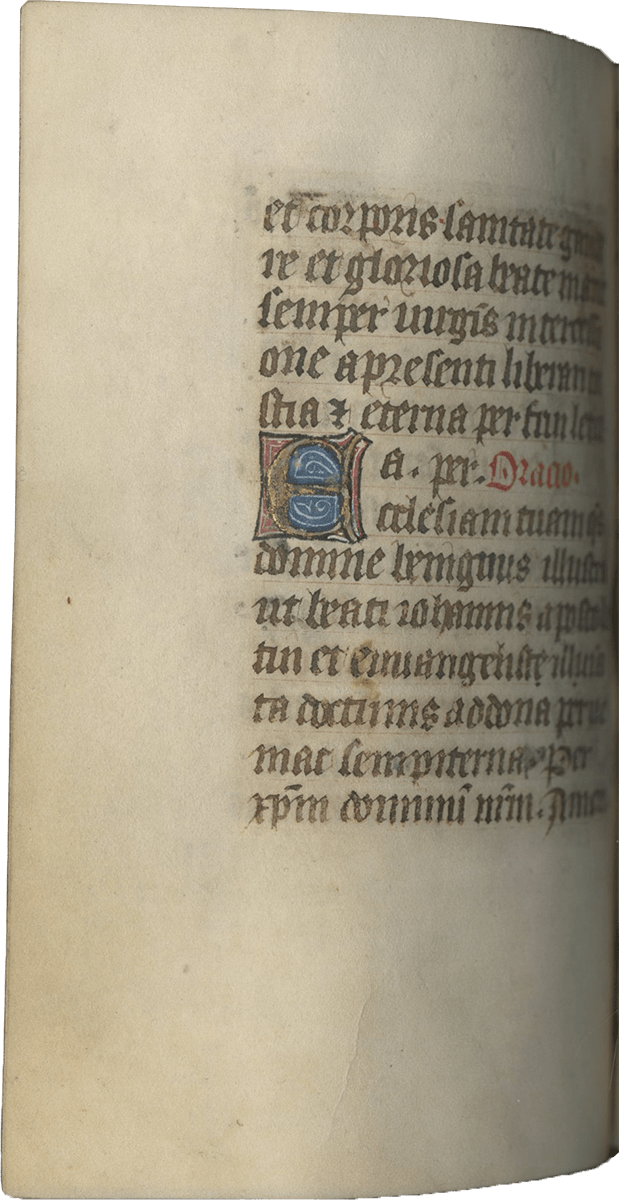 1. Illuminated and copied in France, most certainly Paris, based on linguistic, liturgical and stylistic elements. Liturgically, both the Hours of the Virgin and the Office of the Dead are for the use of Paris. The Calendar is certainly Parisian (two feast days for Geneviève, patron saint of Paris; presence of Denis (in red). Noteworthy however, there are a number of saints also pointing towards the North or Picardie (double solemnity in red for Éloi (patron saint of Noyon), Bertin, Vaast etc.).