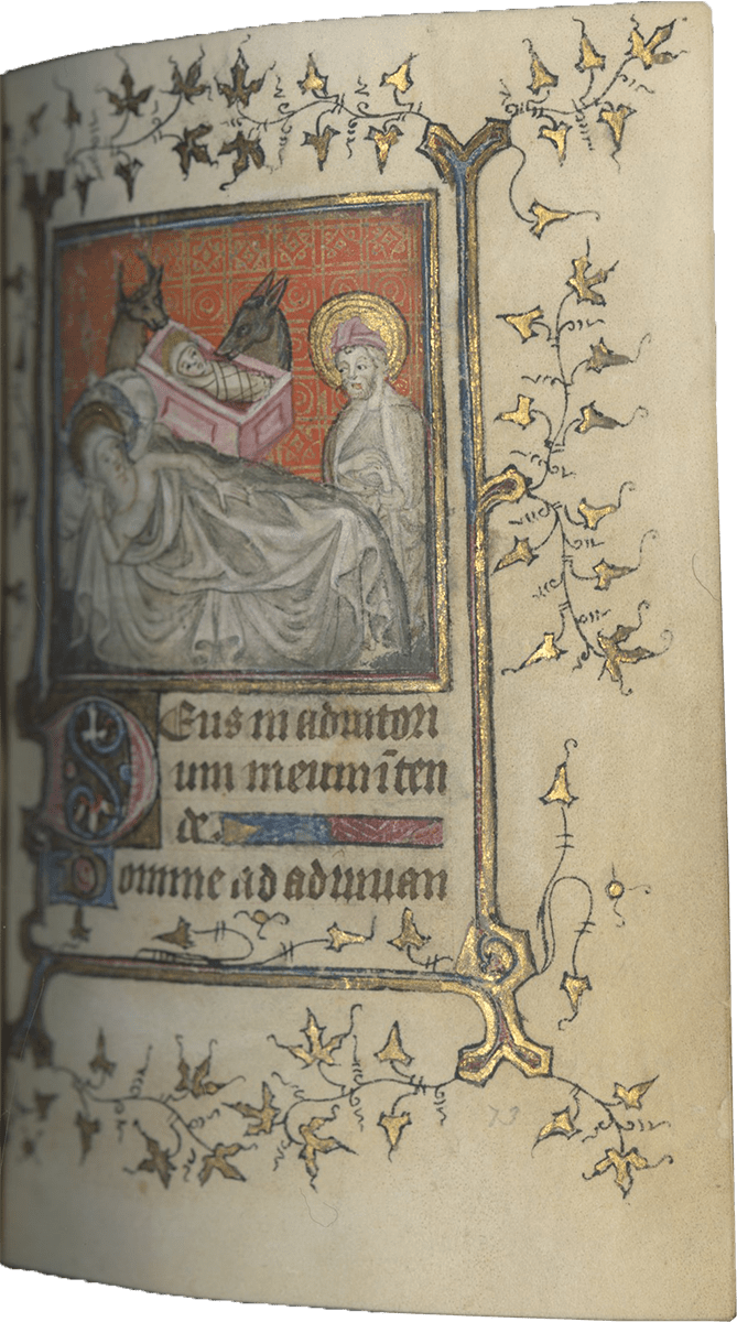 f. 73, Nativity (half-page miniature, dimensions: 50 x 55 mm);