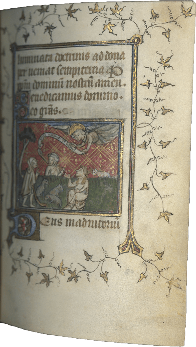f. 80, Annunciation to the Shepherds (half-page miniature, dimensions: 50 x 42 mm);