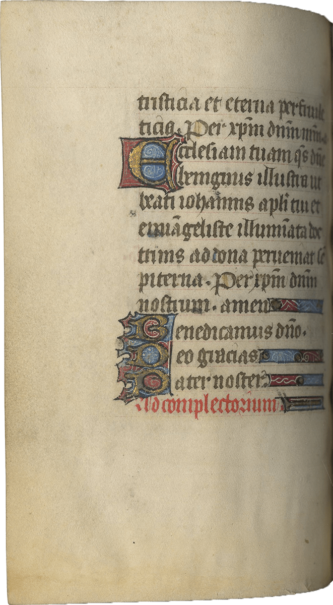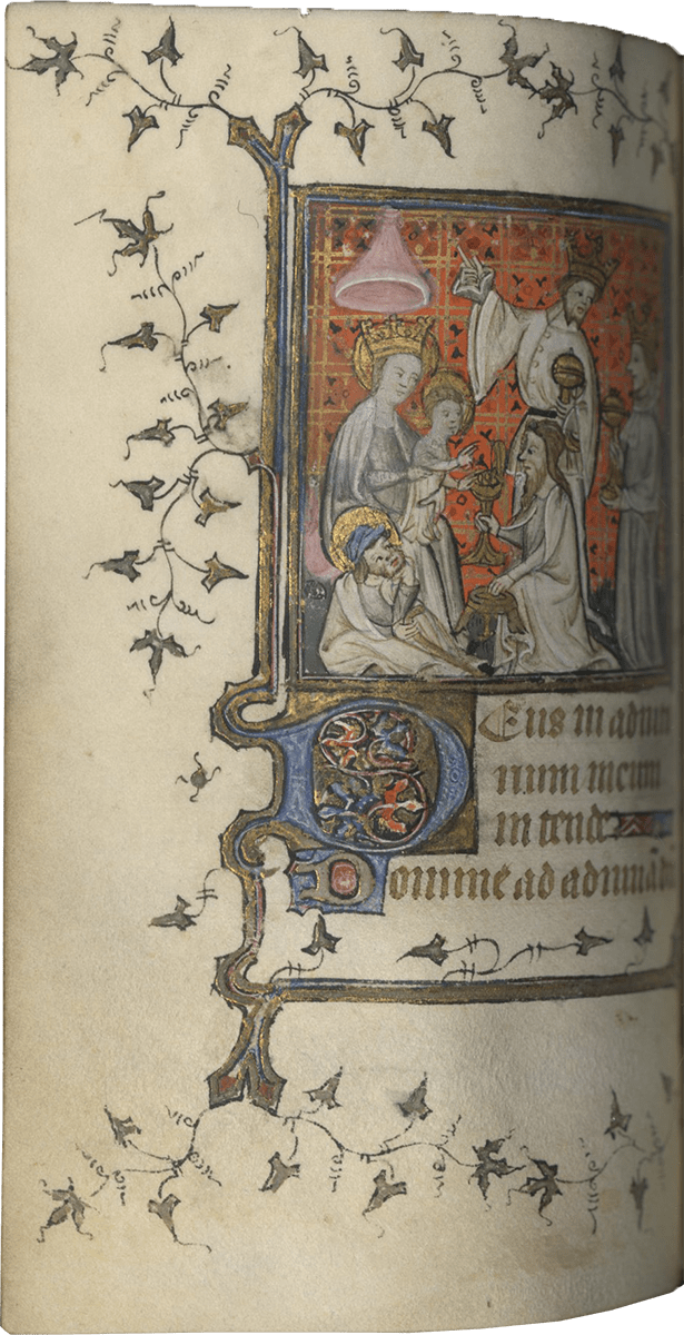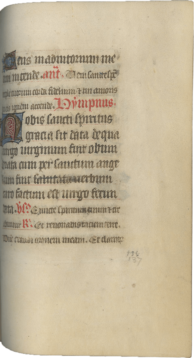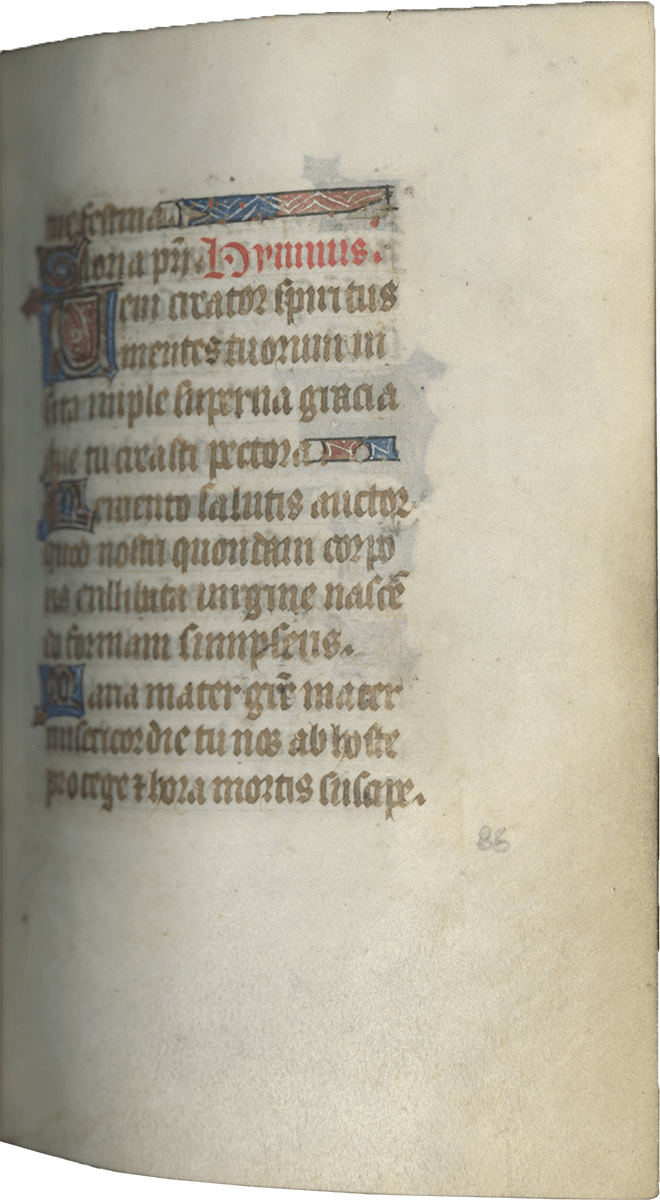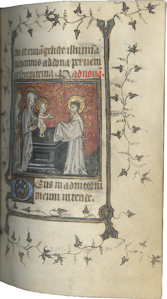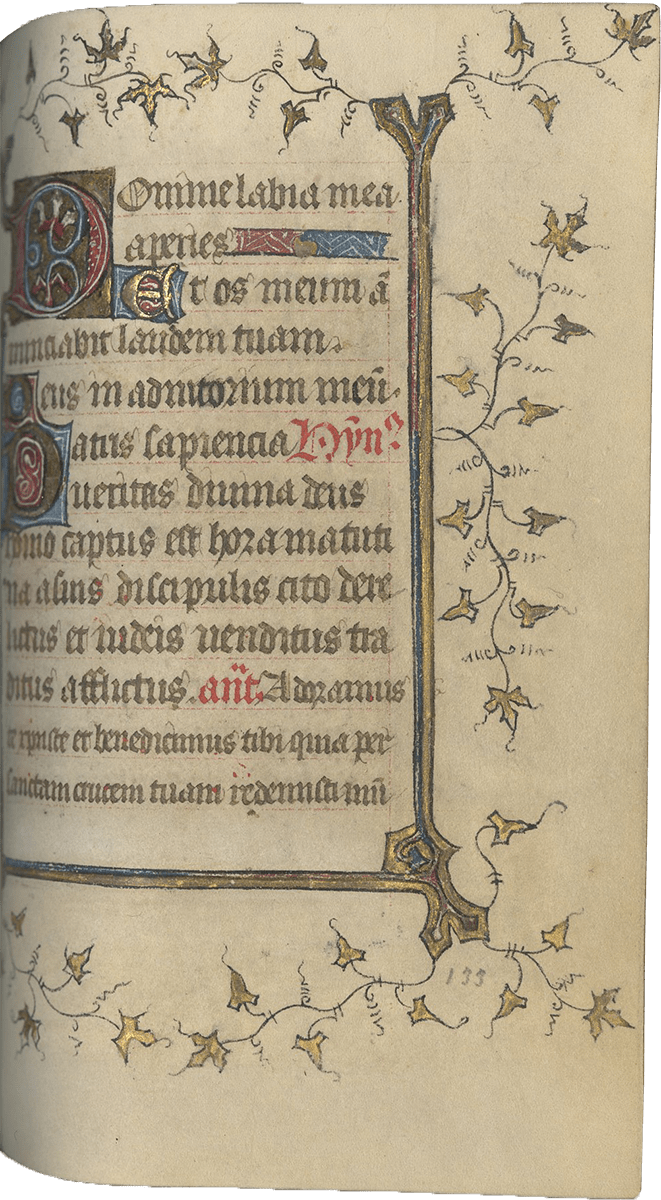 ff. 32-109, Hours of the Virgin, use of Paris, with Matins (ff. 32-59); Lauds (ff. 59-72v [no miniature]); Prime (ff. 73-80), antiphon, “Benedicta tu” and capitulum, “Felix namque”; Terce (ff. 80-85); Sext (ff. 85v-90); None (ff. 90-95), antiphon, “Sicut lilium” and capitulum, “Per te dei”; Vespers (ff. 95-102v); Compline (ff. 103-109);