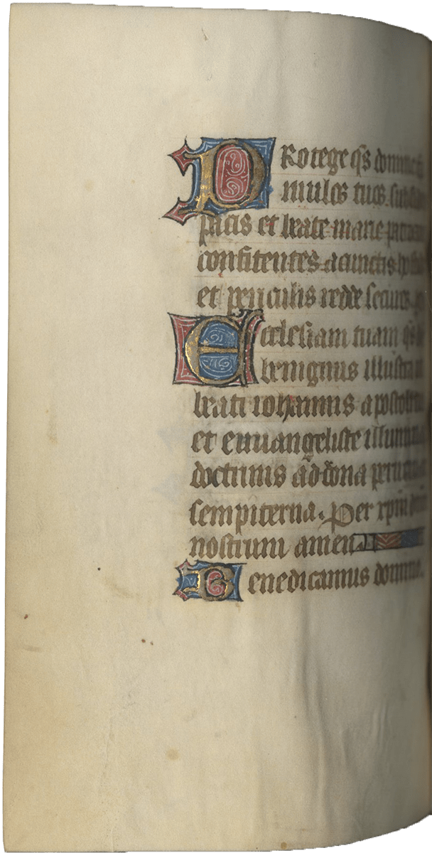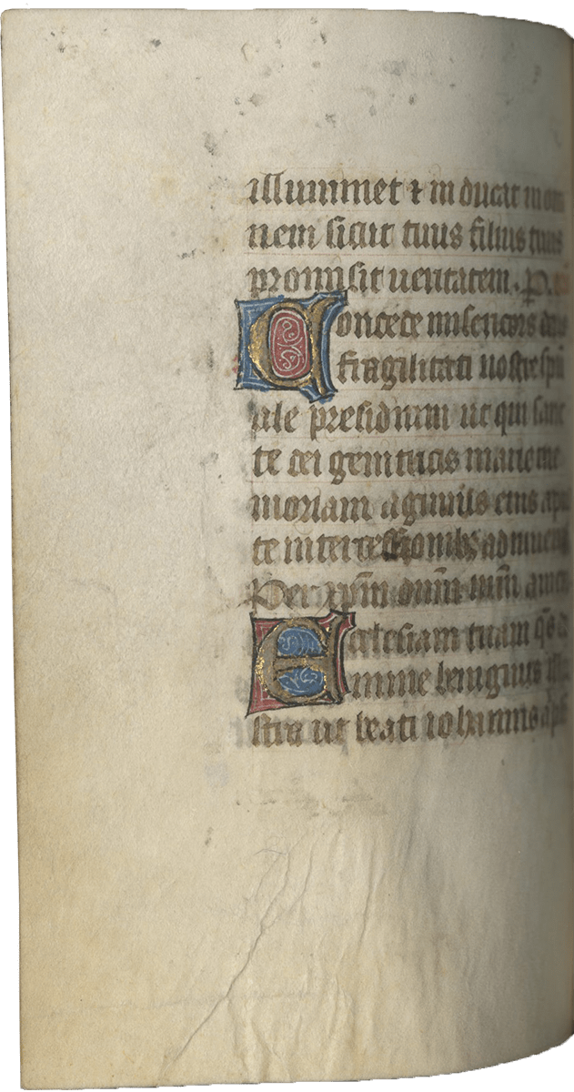 The Ravenelle Painter was a French manuscript illuminator active between 1390 and 1405. Little is known about him. Lindqvist Sandgren describes his art as such: “The painting in the books of hours conforms with the characteristics that distinguish the Ravenelle Painter: a distinct contour line, elongated upper bodies, and round faces with contented expressions…Also the background landscape is sparse and decorative patterns fill the diapered polychrome backgrounds…” (Lindqvist Sandgren, 2002, p/ 54). Eva Lindqvist Sandgren used stylistic comparison to identify this artist as the illuminator of a Book of Hours datable between 1400 and 1405 now in the Uppsala University Library, known as the Johannette Ravenelle Hours (MS C 517e). This identification is now widely accepted. The artist – for whom we have little biographical information – lived and worked in Paris, producing large secular works as well as religious treatises written in the vernacular in French. He also is known to have painted a few Books of Hours and the presence of vernacular texts in these Horae is noteworthy (see Text below). The present Horae contain over twenty leaves of vernacular prayers, in particular the very interesting Obsecro te and O Intemerata translated in French).