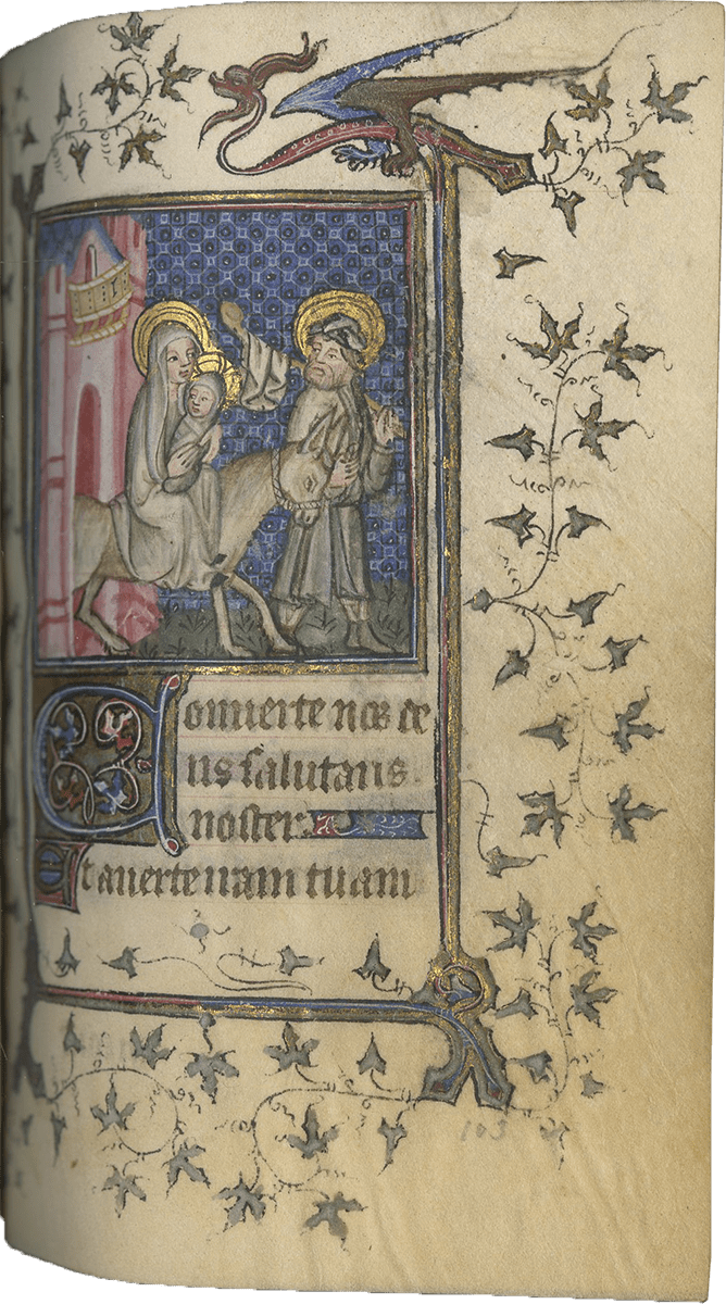 f. 103, Flight into Egypt (half-page miniature, dimensions: 50 x 55 mm);