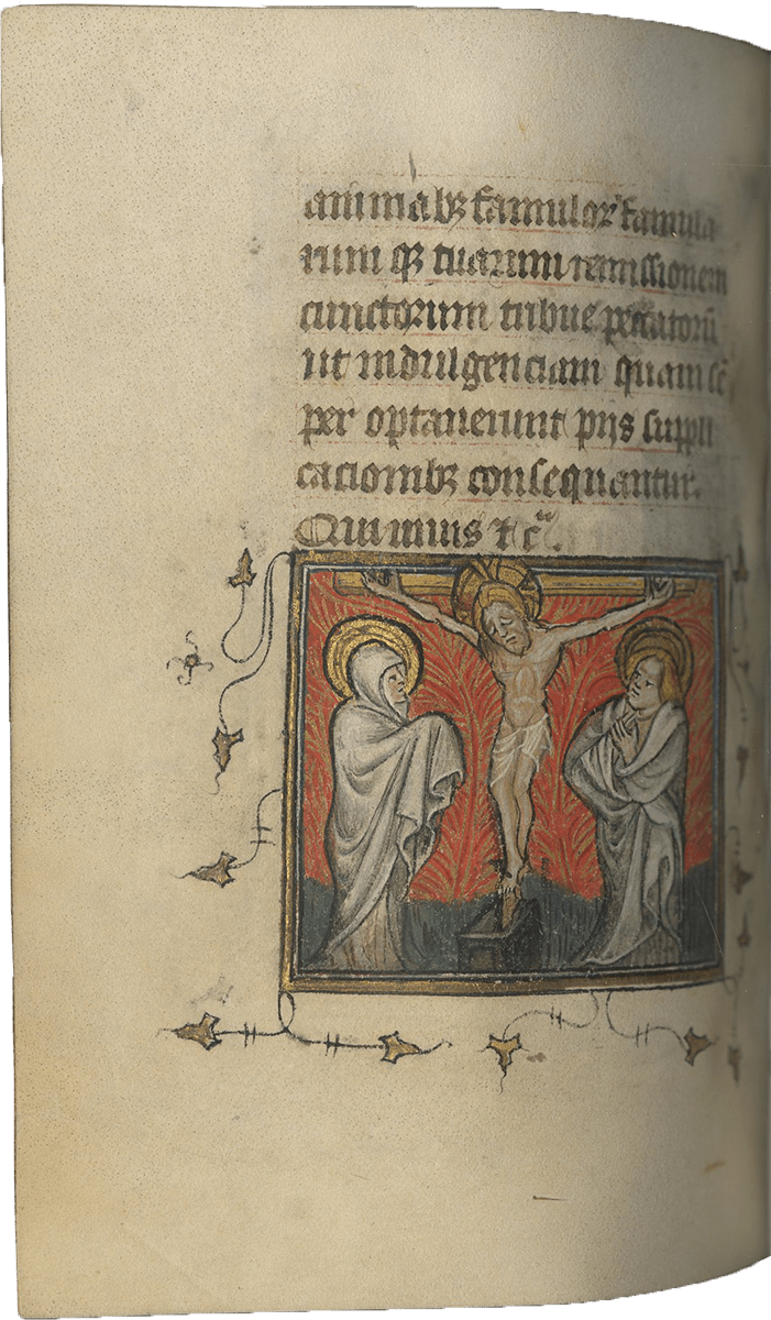 f. 132v, Crucifixion between Mary and John the Evangelist (half-page miniature, dimensions: 50 x 55 mm);