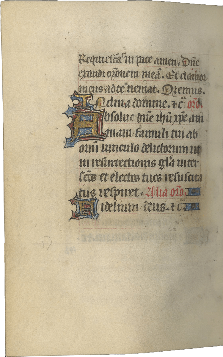 ff. 140v-196v, Office of the Dead (use of Paris according to the uses identified by the Chanoine Leroquais), with the following readings: (1) Qui Lazarum; (2) Credo quod ; (3) Heu michi ; (4) Ne recorderis ; (5) Heu michi [perhaps a scribal mistake as usually one finds here “Domine quando”]; (6) Peccantem me [confusion of the scribe as the rubric indicates “lectio Va” instead of “VIa”] ; (7) Domine secundum ; (8) Memento mei; (9) Libera me;