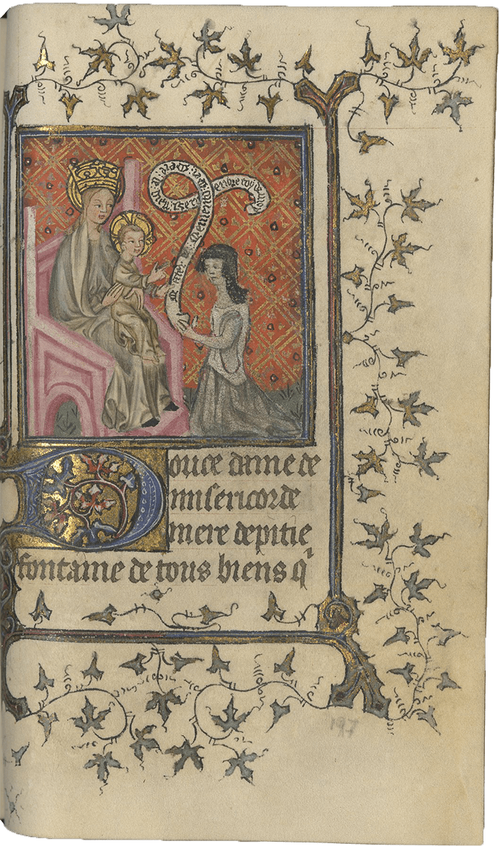 f. 197, Virgin and Child, with an Owner image, Female Donor in Prayer holding a scroll in Latin and French [Mater dei memento mei. Mere de dieu remembre toy de moy] (half-page miniature, dimensions: 52 x 55 mm). The face of the female donor appears to have been retouched.