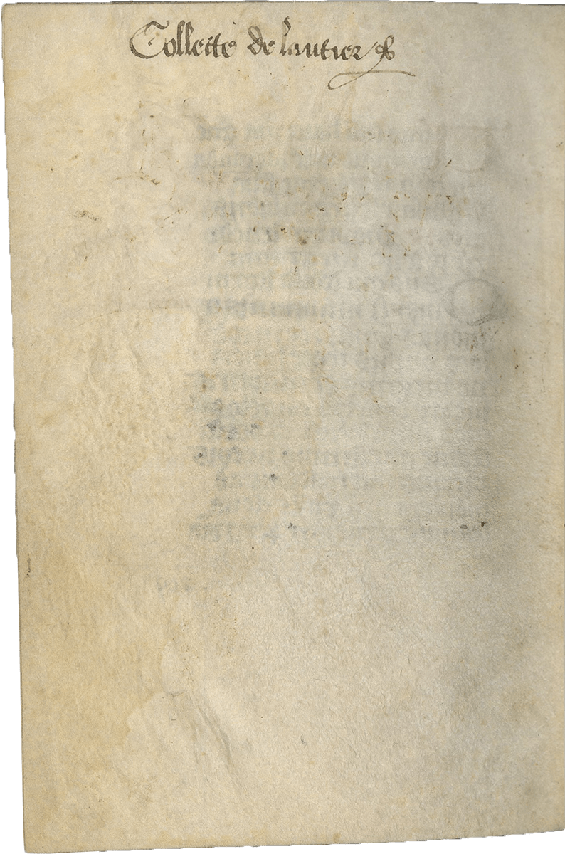 An inscription is found on fol. 209 verso: “Collette de Lautier.” This hand is contemporary or near-contemporary with the manuscript and could potentially be the first or at least one of the earlier owners of this book. The last miniature figures a female donor: might this be Colette de Lautier kneeling in prayer before the Virgin and Child? Below the name “Collette de Lautier” was once an inscription, still perceptible, but now largely erased.