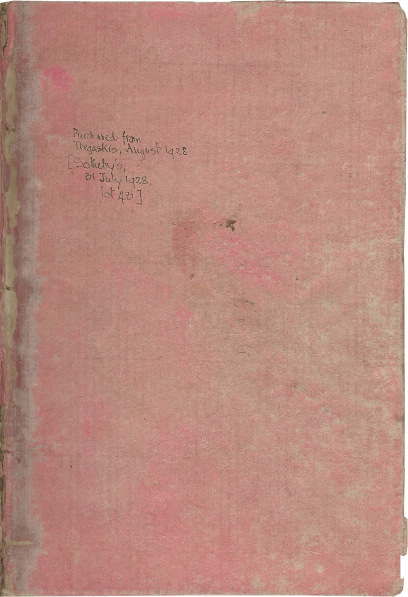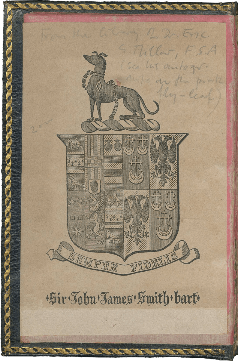 2. Sir John James Smith (1800-1862), 3rd baronet, with his nineteenth-century armorial bookplate as baronet (therefore acquired 1852-62); by descent to the sixth baronet, Sir William John Smith-Marriot (1870-1941); his sale at Sotheby’s London, 31 July 1928, lot 43, to Tregaskis.