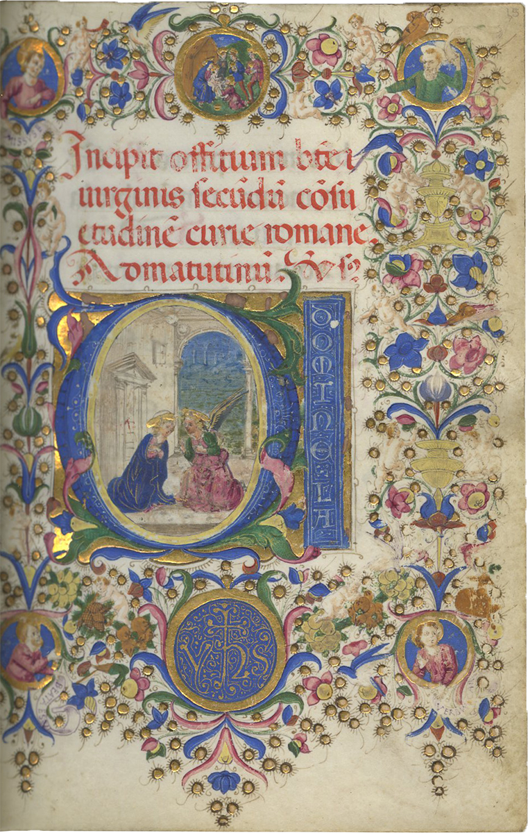 f.15, The Annunciation, set in the courtyard of a classical palace, large historiated initial; full border including 12 putti, 4 birds, a seated deer, and six roundels showing the Adoration of the Magi at the top and the Holy Monogram 'YHS' at the foot, with the Evangelists with scrolls in each of the four corners, St. Luke “missus e[st]” (Luke 1:26), St. Matthew, St. John with “verbum car[o factum est]” John 1:14) and St. Mark with “beata es vi[rgo].”