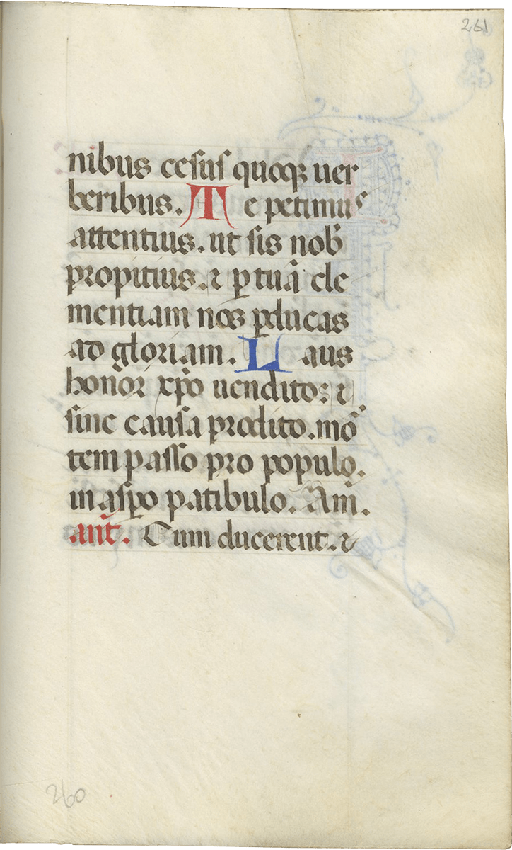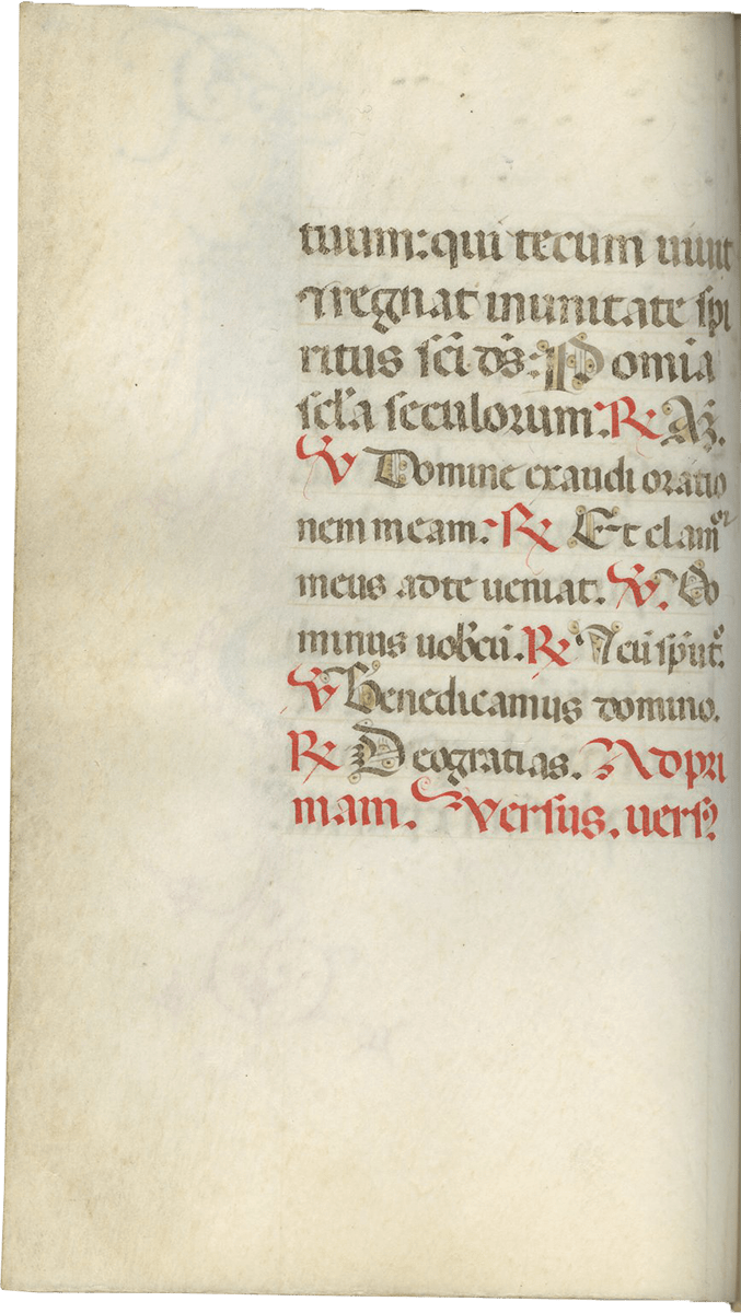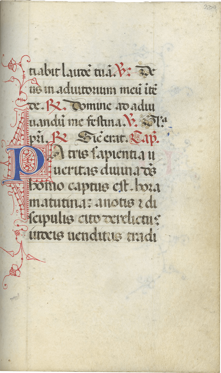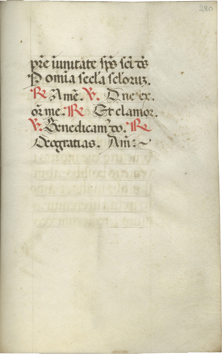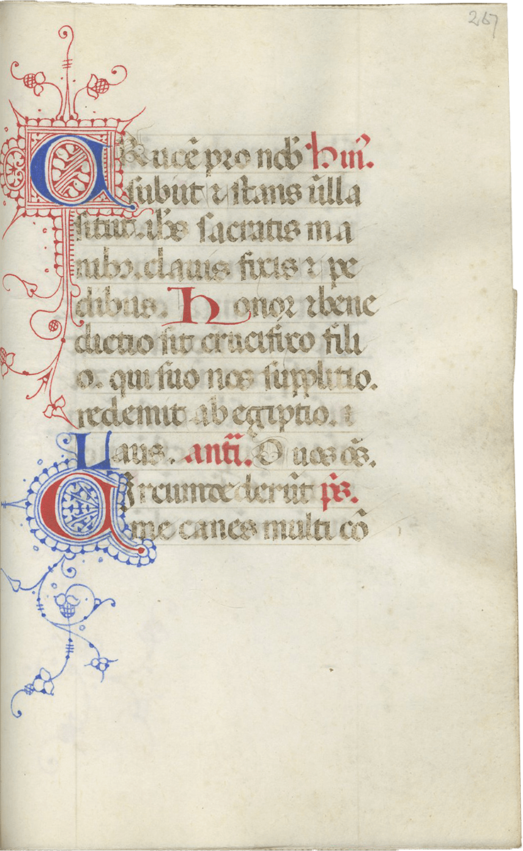 247- 280, Office of the Cross (major), with Lauds (f. 257), Prime (f. 260v), Terce (f. 263v), Sext (f. 266v), None (f. 269v), Vespers (f. 272v), and Compline (f. 276v) ending f. 280, “Deo gratias, Amen.”