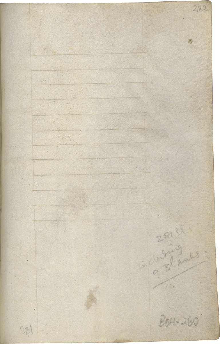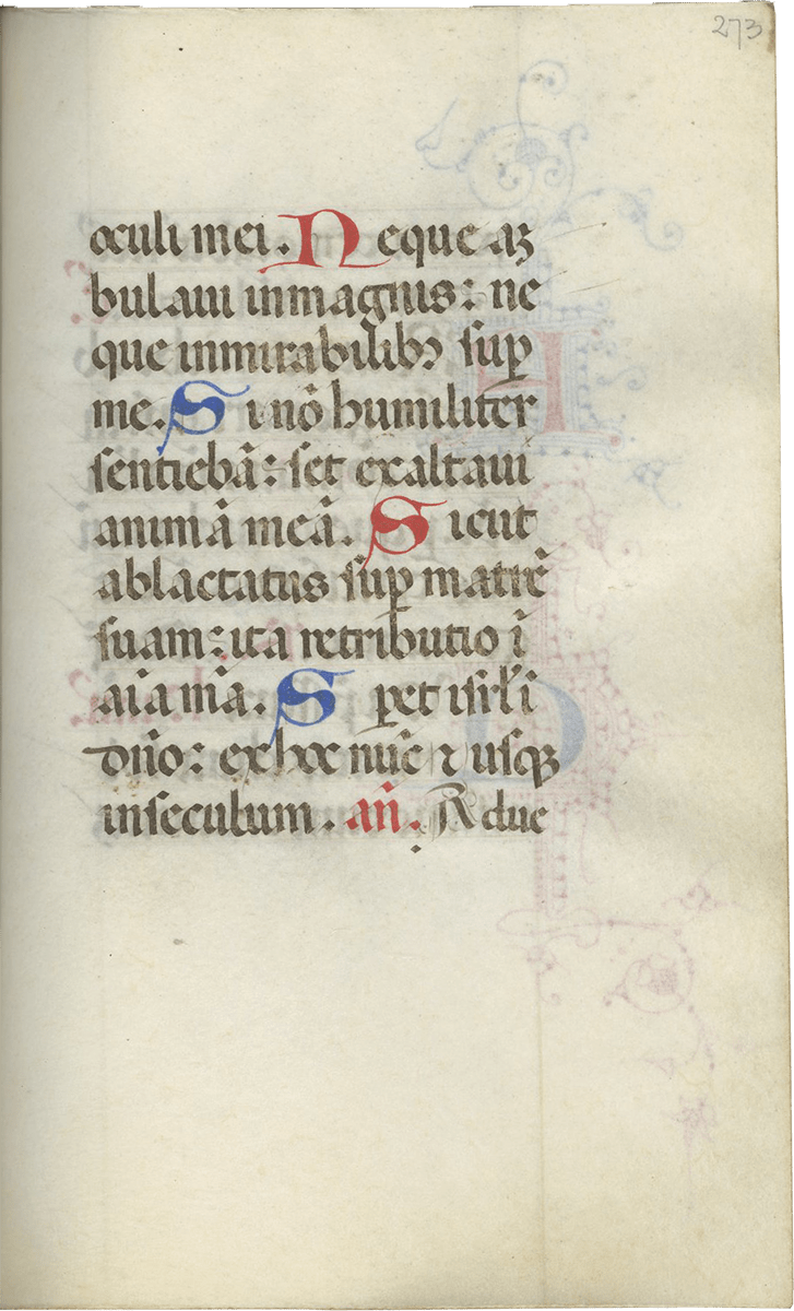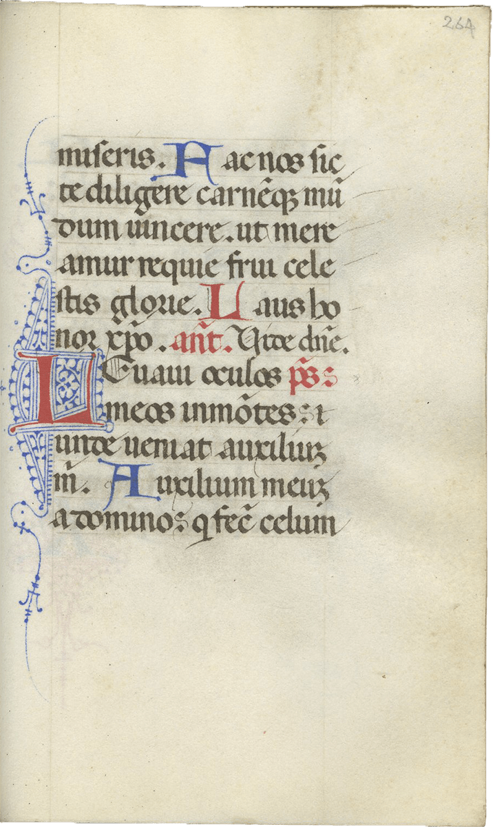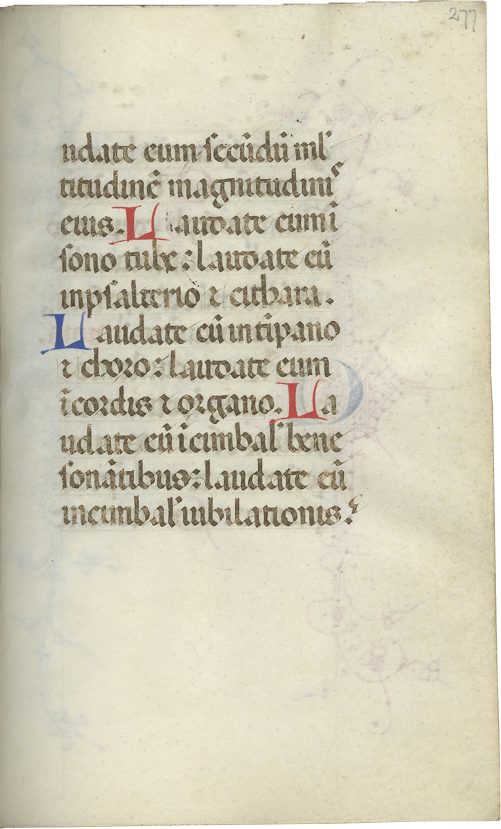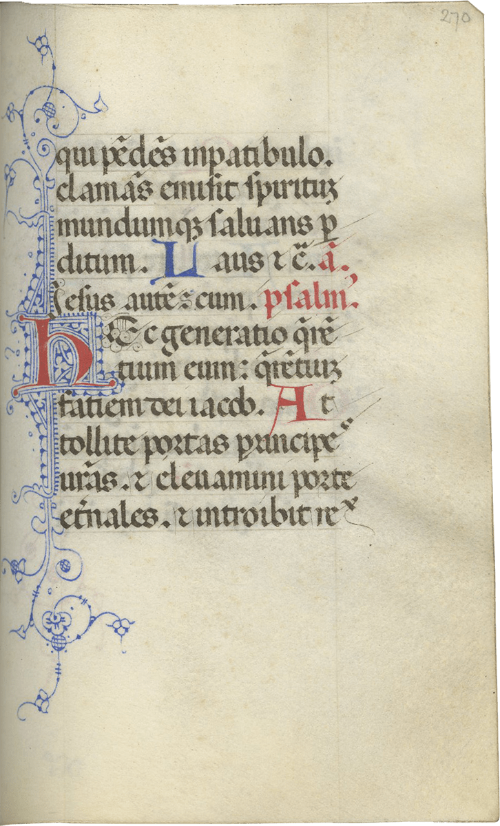 247- 280, Office of the Cross (major), with Lauds (f. 257), Prime (f. 260v), Terce (f. 263v), Sext (f. 266v), None (f. 269v), Vespers (f. 272v), and Compline (f. 276v) ending f. 280, “Deo gratias, Amen.”