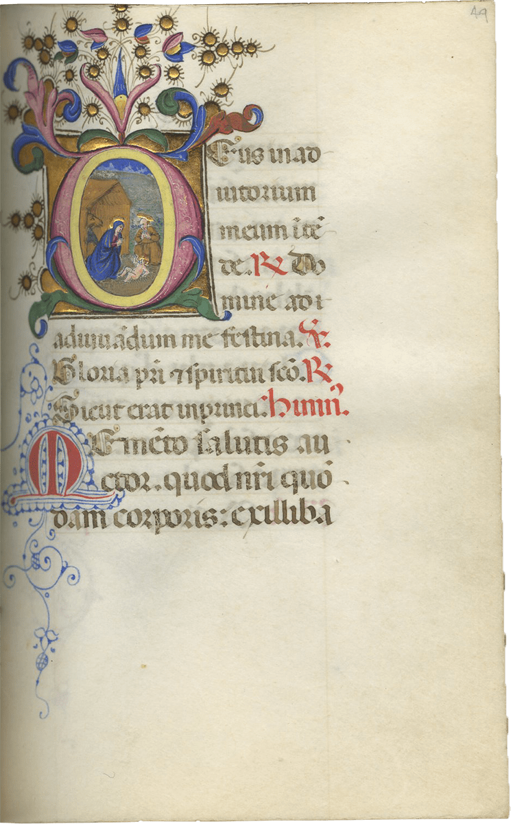 f. 49, The Nativity of Christ, set beside the end of the stable in a night landscape;