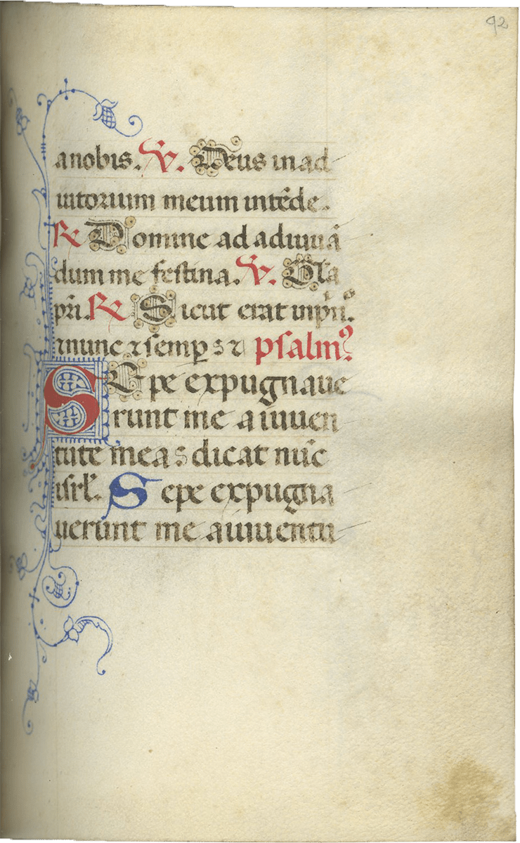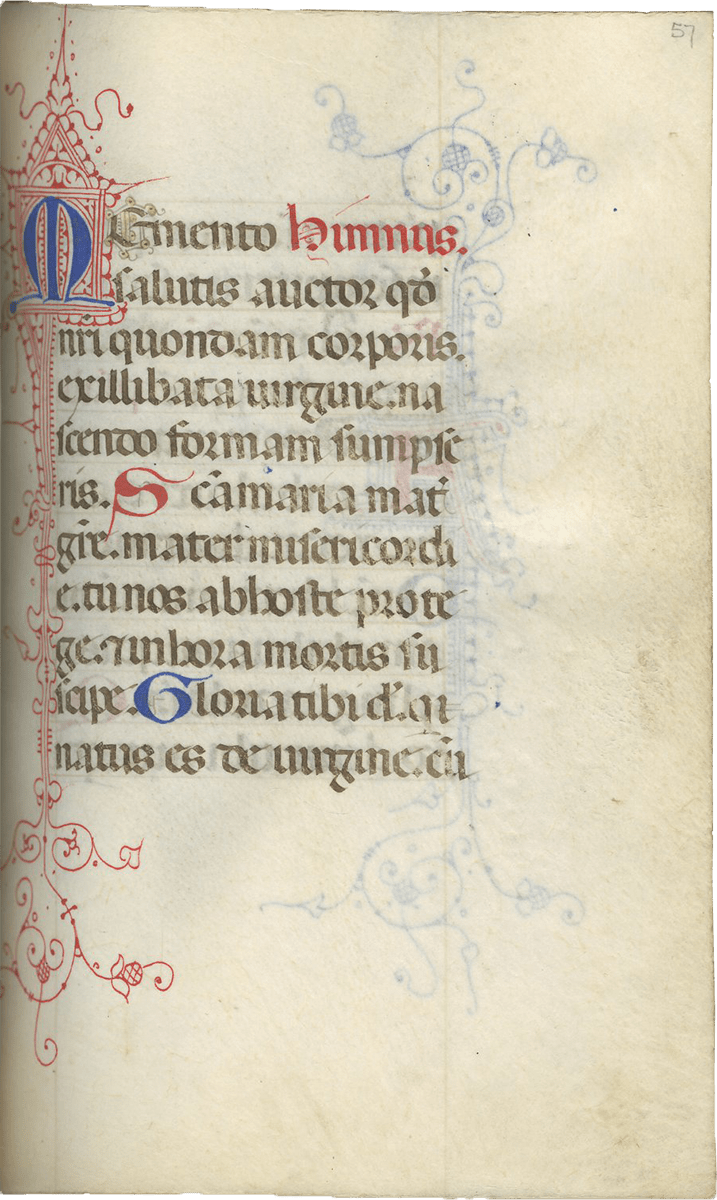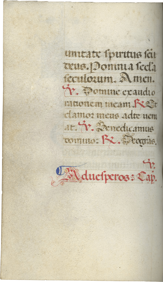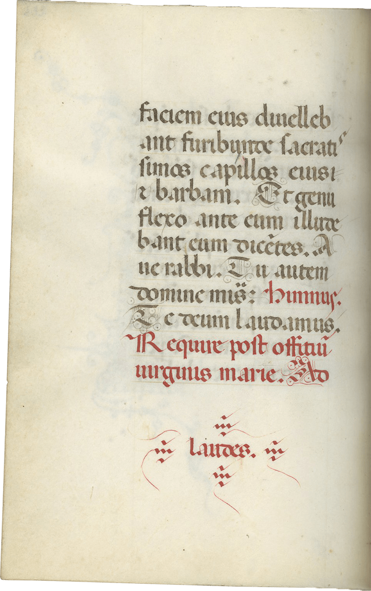 ff. 15-101v, Hours of the Virgin (use of Rome), "secundum consuetudinem romane curie" with Matins (f.15), Lauds (f. 30), Prime (f. 49), Terce (f. 56v), Sext (f. 63v), None (f. 70v), Vespers (f. 78) and Compline (f. 91 v), with weekly and seasonal variants (f.101v);