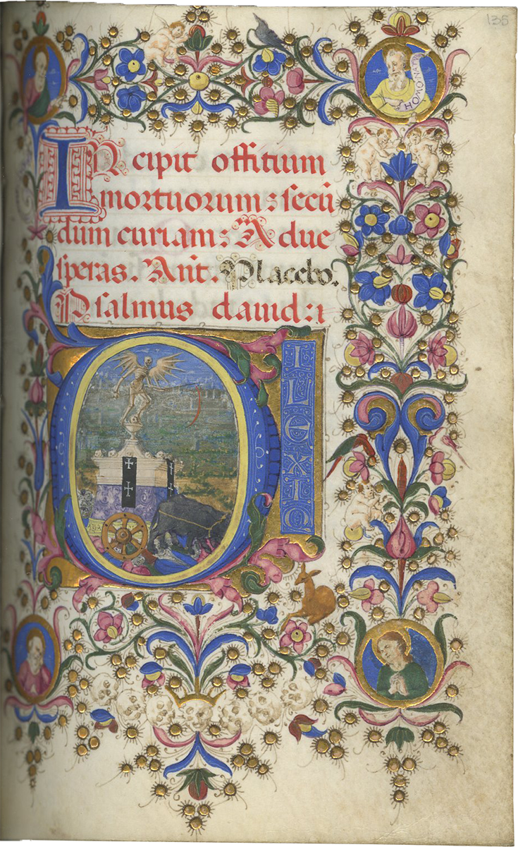 f. 135, The Triumph of Death, a winged skeleton with a scythe standing on a great chariot formed of a sarcophagus on a cart draped in purple and pulled by two oxen, driving through a barren landscape and crushing beneath its wheels people of all levels of society, large historiated initial; full border including 4 putti, 3 birds, 7 skulls, a seated deer and roundels of four figures of whom two hold scrolls, “morte mem[ento]” and “homo natus” Job 14:1);