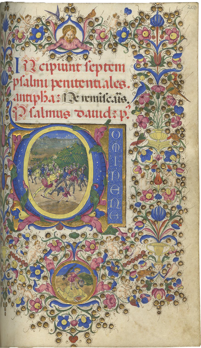f. 203, Uriah being killed in battle (at the instigation of King David who planned thereby to marry the new widow Bathsheba), large historiated initial; full border including 8 putti, two heads of cherubim, 8 birds, a figure of God looking down from the sky and a roundel of David killing Goliath;