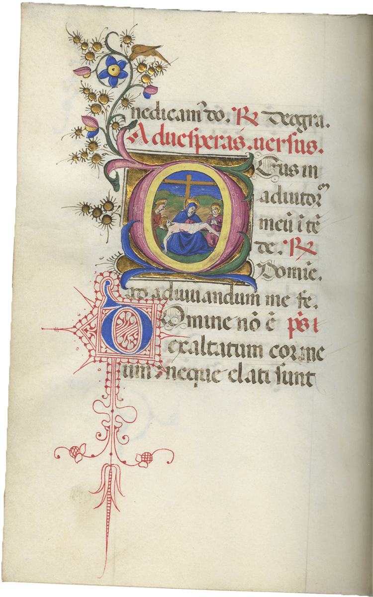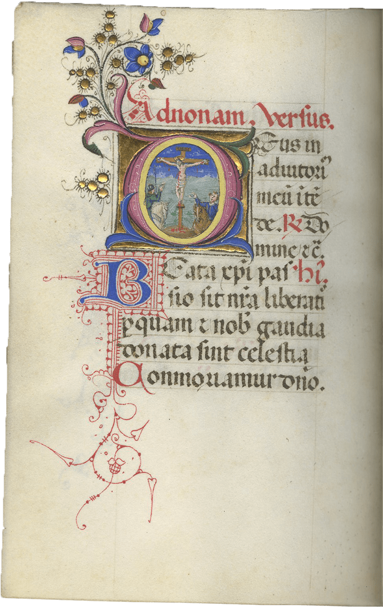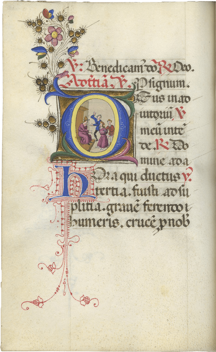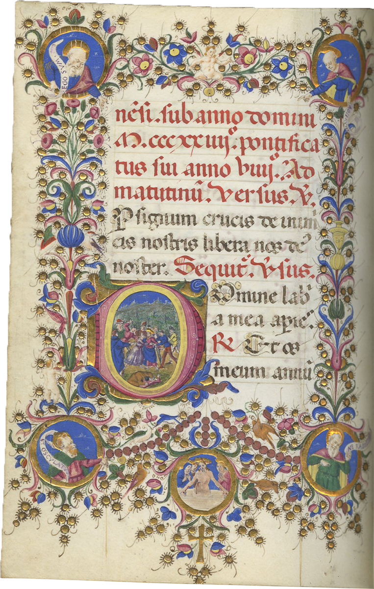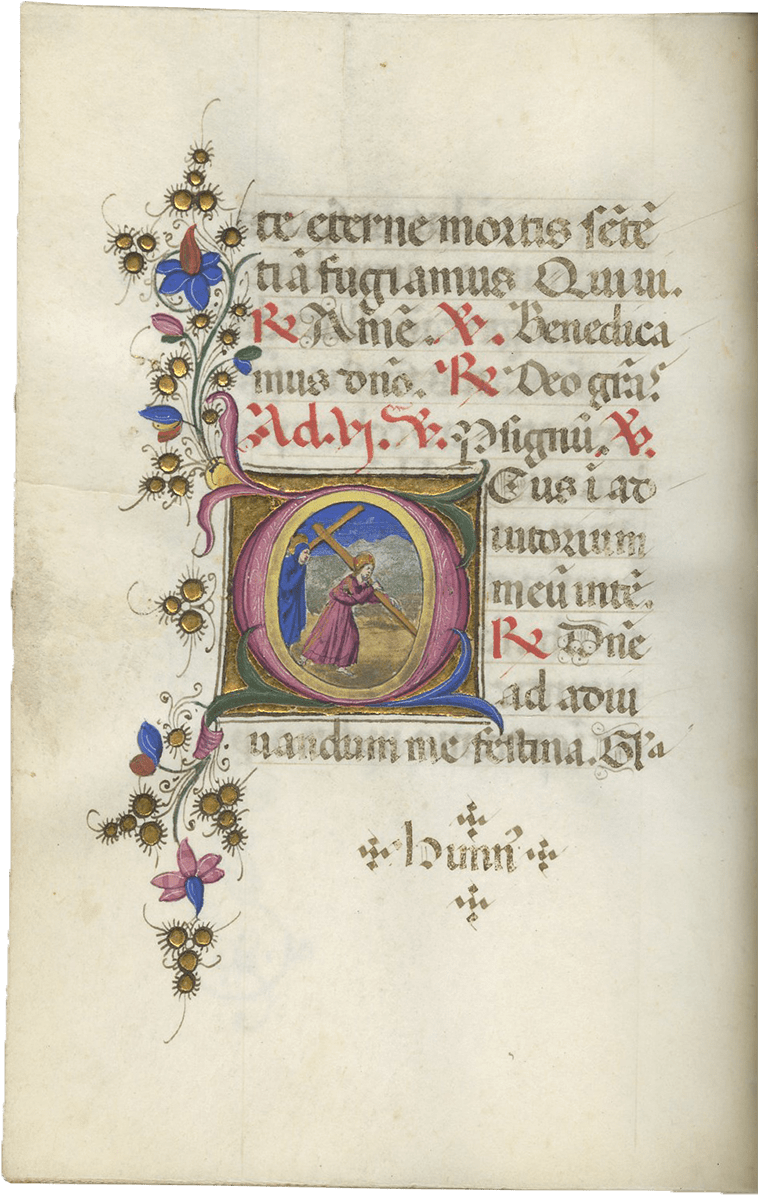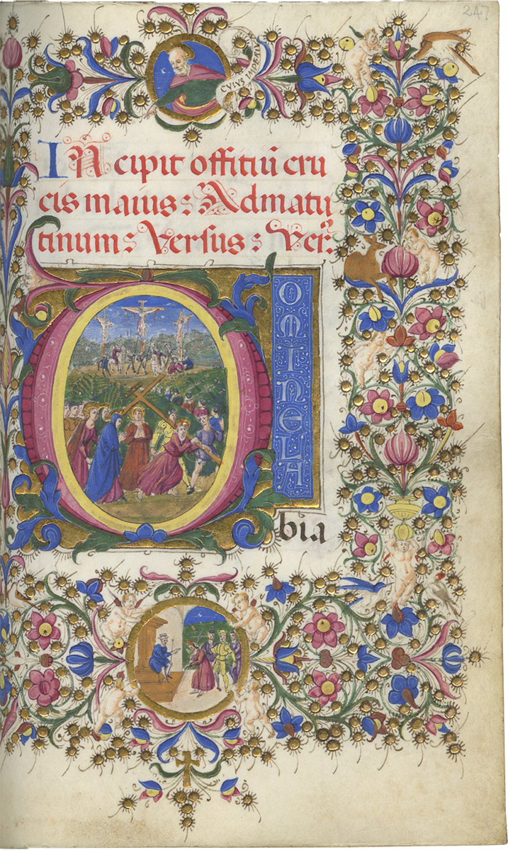 f. 247, Christ carrying the Cross, in the center of a long procession of soldiers and saints winding up a hill to Golgotha where the Crucifixion is already taking place between the two thieves, with a crowd of people at the foot of the Cross including the centurian on horseback, large historiated initial; full border including 8 putti, 5 birds, a seated deer, a gold cross and roundels of an evangelist with a scroll “cuius imperium” and of Christ led before Pilate;