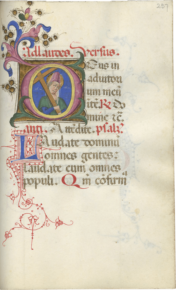 f. 257, A saint holding a cross;