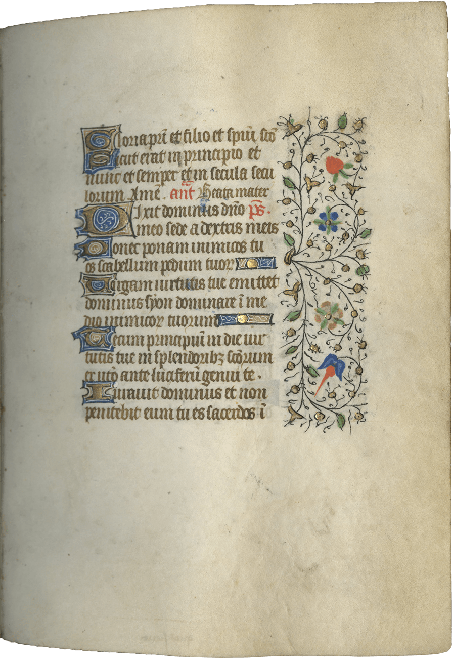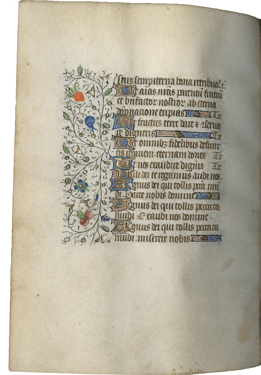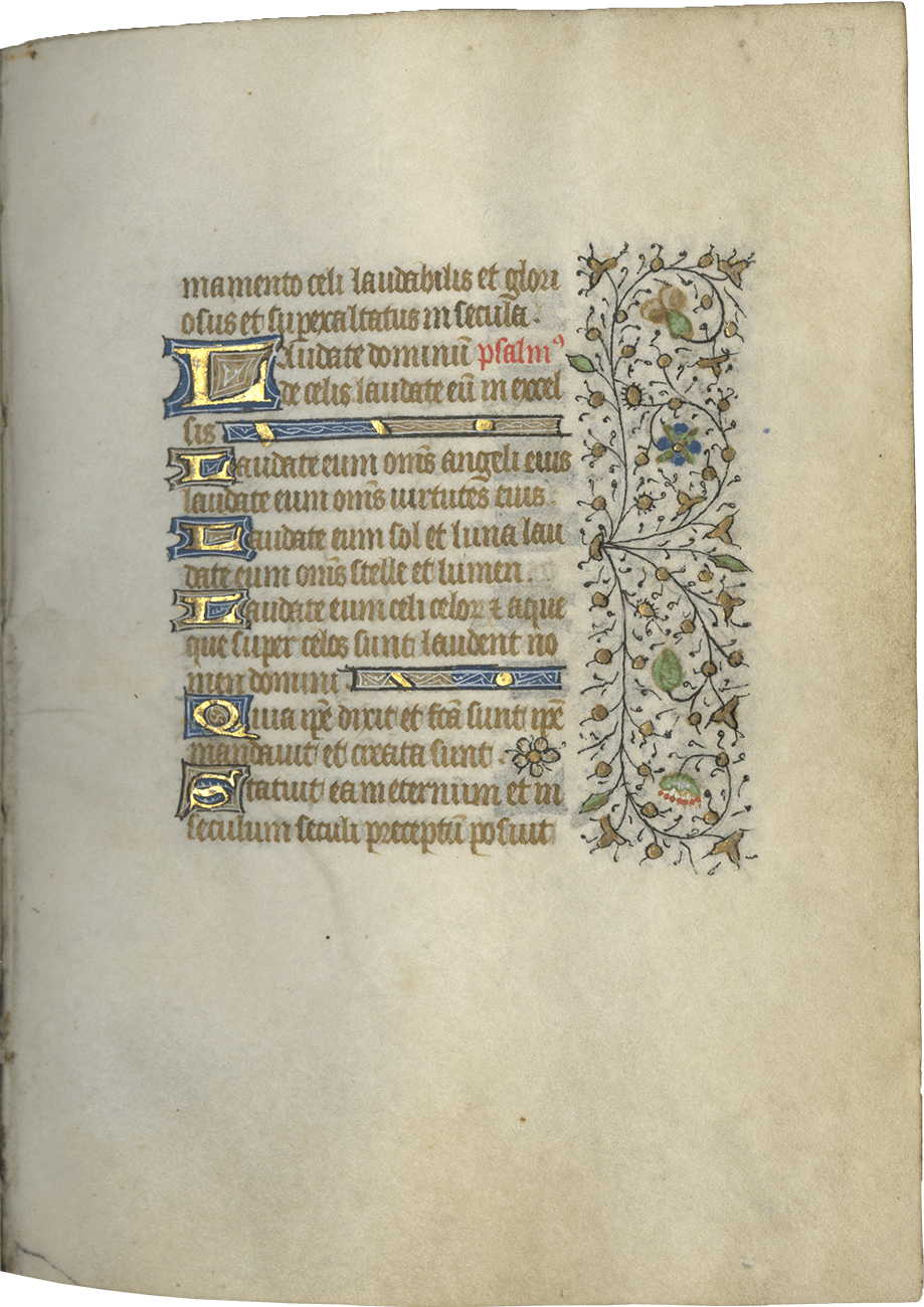 i (modern parchment) + 108 + iii (parchment) leaves, modern pencil foliation in upper right corner, lacking eight leaves with miniatures and several with loss of text (collation: i-iii6, iv8-1 (after f. 23, with miniature), v8-2 (after 27 and 33, with loss of text), vi6-1 (after f. 34, with loss of text), vii6-1 (after 40, with miniature), viii8-2 (after 43, with miniature, and after 47, with text), ix8-1 (after 50, with miniature), x8-1 (after 63, with loss of text), xi8-1 (after 70, with miniature), xii8-1 (after 74, with miniature), xiii-xv8, xvi8-1+1 (after 101, with miniature, added flyleaf after 109), xvii2), with strings visible, some quires with catchwords, ruled in red for 16 lines (written space: 98 x 62mm), written in dark brown ink in a gothic liturgical hand, rubrics in red, line fillers in gold, red, and blue with white tracery, one-line and two-line initials in burnished gold on alternately red and blue ground with white tracery, every text page with side floral borders of ivy leaves and flowers on hairline tendrils, [one] five-line initial in blue on burnished gold ground, in-filled with red and blue flowers, with white tracery, with gold and red baguette outer-side frame, FIVE LARGE ARCH-TOPPED MINIATURES above three-line illuminated initials of the same, with full floral border of ivy leaves and flowers on hairline tendrils, with acanthus sprouts emerging from gold and silver vases (miniatures often rubbed and smudged, stains in floral borders, many leaves worn and rubbed). Bound in a contemporary (original?) fifteenth-century blind-stamped binding of brown calf over wooden boards, stamped in concentric frames with small tools of ropework, the Pascal Lamb, dears, a double-headed eagle, a rosette, a monkey looking in a mirror, a flower, and a dog, three out of four quatrefoil pins with stubs of clasps on edge of upper cover, two quatrefoil pins for clasp catches on lower cover (binding worn, rebacked, new flyleaves, otherwise in very good condition). Dimensions: 210 x 150 mm.