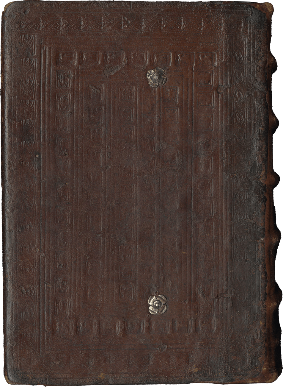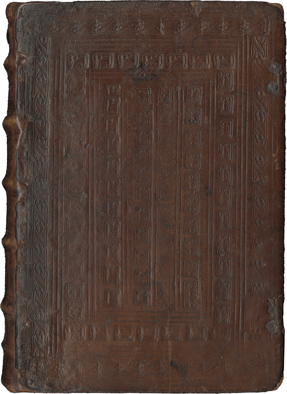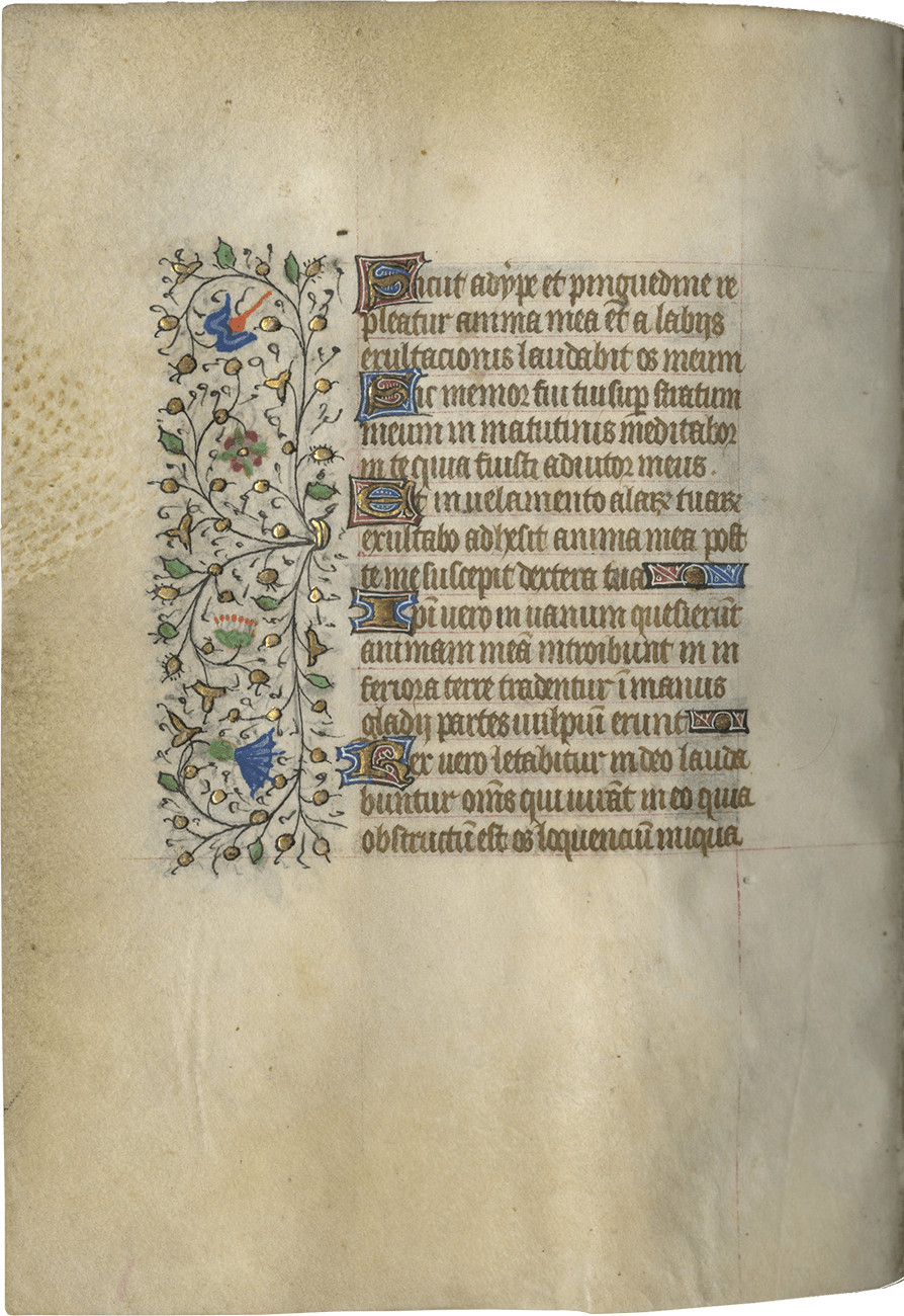 i (modern parchment) + 108 + iii (parchment) leaves, modern pencil foliation in upper right corner, lacking eight leaves with miniatures and several with loss of text (collation: i-iii6, iv8-1 (after f. 23, with miniature), v8-2 (after 27 and 33, with loss of text), vi6-1 (after f. 34, with loss of text), vii6-1 (after 40, with miniature), viii8-2 (after 43, with miniature, and after 47, with text), ix8-1 (after 50, with miniature), x8-1 (after 63, with loss of text), xi8-1 (after 70, with miniature), xii8-1 (after 74, with miniature), xiii-xv8, xvi8-1+1 (after 101, with miniature, added flyleaf after 109), xvii2), with strings visible, some quires with catchwords, ruled in red for 16 lines (written space: 98 x 62mm), written in dark brown ink in a gothic liturgical hand, rubrics in red, line fillers in gold, red, and blue with white tracery, one-line and two-line initials in burnished gold on alternately red and blue ground with white tracery, every text page with side floral borders of ivy leaves and flowers on hairline tendrils, [one] five-line initial in blue on burnished gold ground, in-filled with red and blue flowers, with white tracery, with gold and red baguette outer-side frame, FIVE LARGE ARCH-TOPPED MINIATURES above three-line illuminated initials of the same, with full floral border of ivy leaves and flowers on hairline tendrils, with acanthus sprouts emerging from gold and silver vases (miniatures often rubbed and smudged, stains in floral borders, many leaves worn and rubbed). Bound in a contemporary (original?) fifteenth-century blind-stamped binding of brown calf over wooden boards, stamped in concentric frames with small tools of ropework, the Pascal Lamb, dears, a double-headed eagle, a rosette, a monkey looking in a mirror, a flower, and a dog, three out of four quatrefoil pins with stubs of clasps on edge of upper cover, two quatrefoil pins for clasp catches on lower cover (binding worn, rebacked, new flyleaves, otherwise in very good condition). Dimensions: 210 x 150 mm.