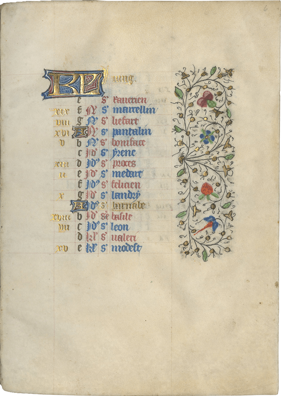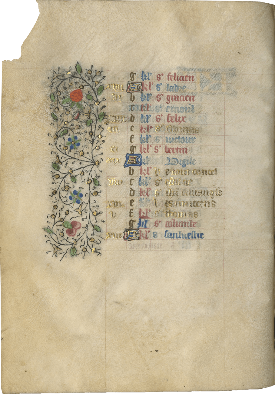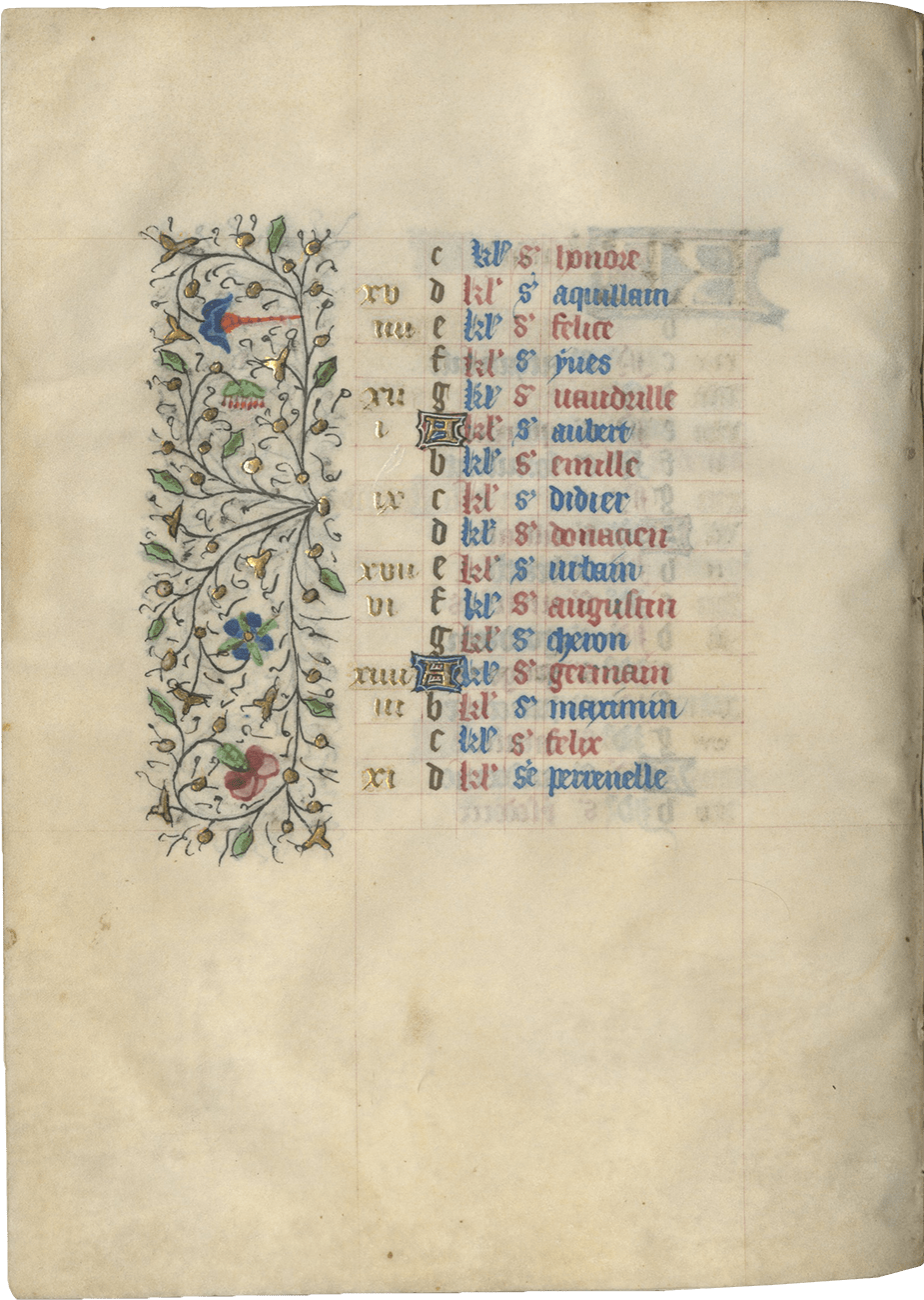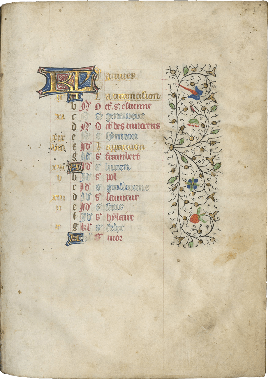 1. Written and illuminated in Paris. Although the liturgical use of the manuscript is unrecorded, the style of illumination is Parisian, and the calendar includes the feasts of St. Genevieve, written in red, and St. Denis, written in gold, both venerated in the city.