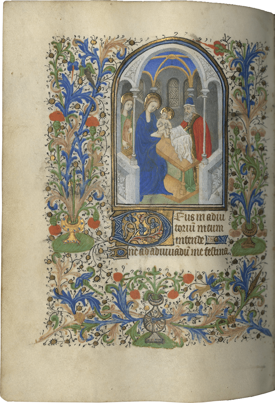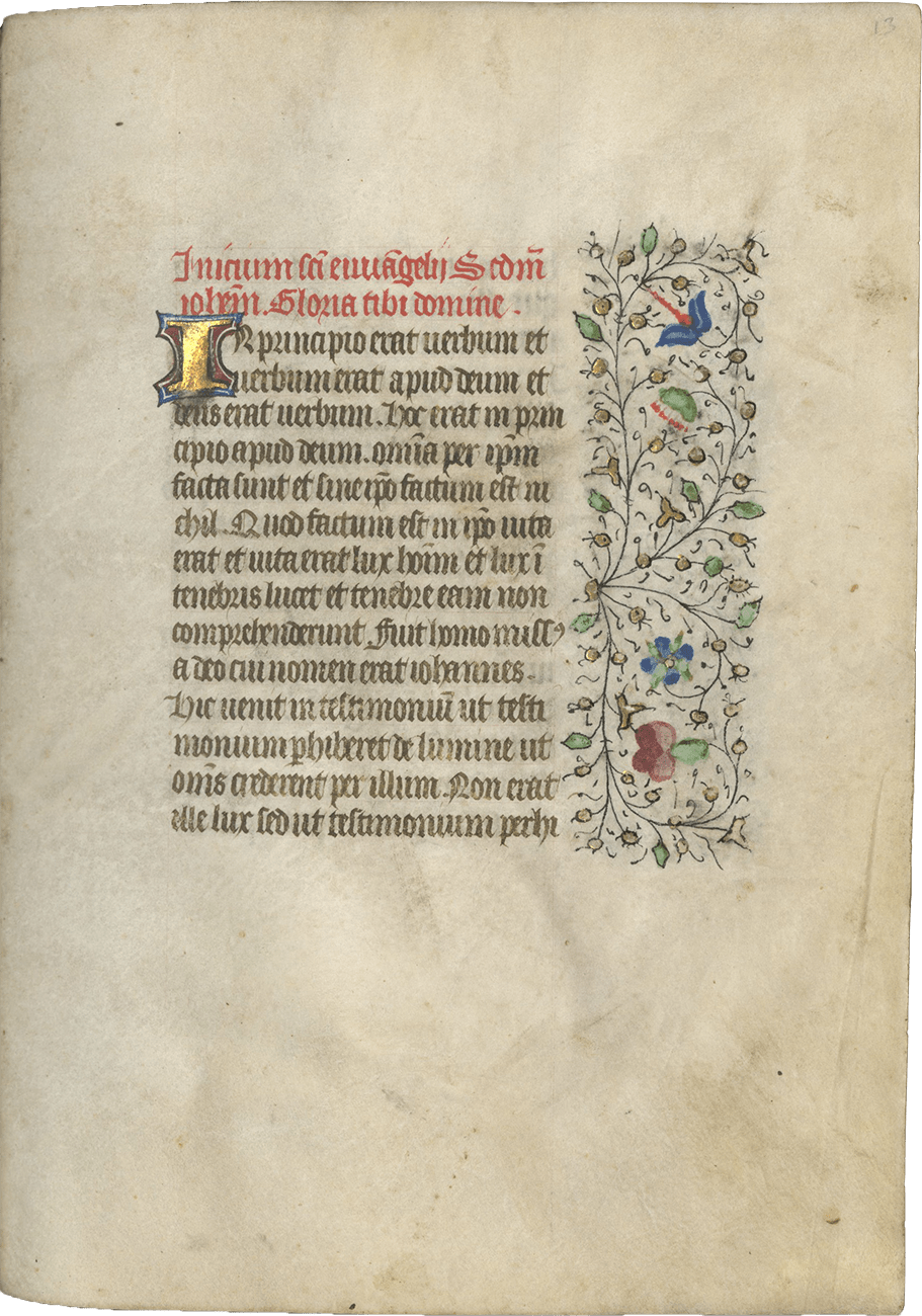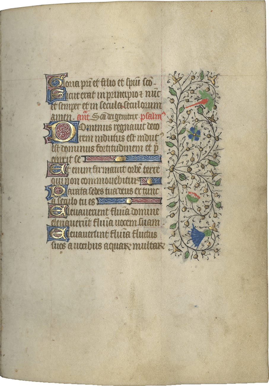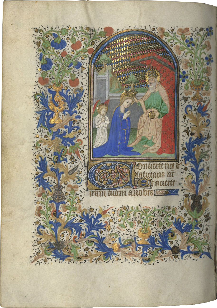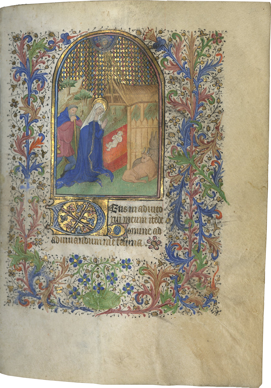 1. Written and illuminated in Paris. Although the liturgical use of the manuscript is unrecorded, the style of illumination is Parisian, and the calendar includes the feasts of St. Genevieve, written in red, and St. Denis, written in gold, both venerated in the city.