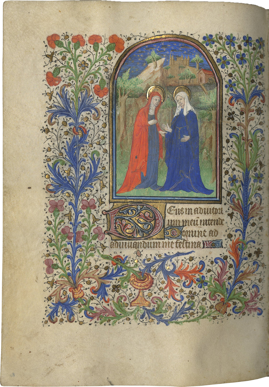 Of particular note here is the landscape of the Visitation, in which the receding depth is remarkably conveyed by the succession of a rising cliff with trees, of a river with a mill and a boat, and of a hill with a castle reduced to a camaieu d’or palette, all set under a deep blue sky with gold stars and silver clouds. These motifs are hallmarks of the innovative approach to landscape characteristic of the Boucicaut Master, an artist often regarded as the first to have perfected the principles of aerial perspective and heralded the achievements of fifteenth-century Northern painting.