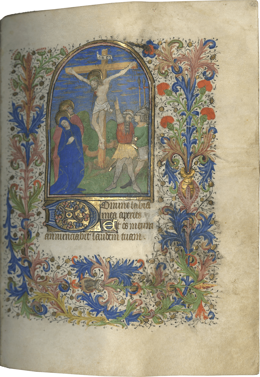 This attractive, large Book of Hours is richly illuminated throughout: every text page is adorned with a panel border and surrounded by very large margins. The five large arch-topped miniatures, accompanied with a generous floral border, have been listed by Gregory Clark among the production of the Master of the Harvard Hannibal (Art in a Time of War, 2016, cited p. 290). Active in Paris from c. 1410 to c. 1430, the artist was named by Millard Meiss after the frontispiece of a manuscript of Livy in the Houghton Library, depicting the Coronation of Hannibal (Harvard University, Houghton Library, Richardson MS 32; Meiss 1968). One of the most distinctive illuminators active in the capital at height of the Hundred Years War, he evidently trained with the Master of Boucicaut, as is further demonstrated by their collaboration in a manuscript of Boccaccio now in Lisbon (Gulbenkian Museum, MS LA 143).