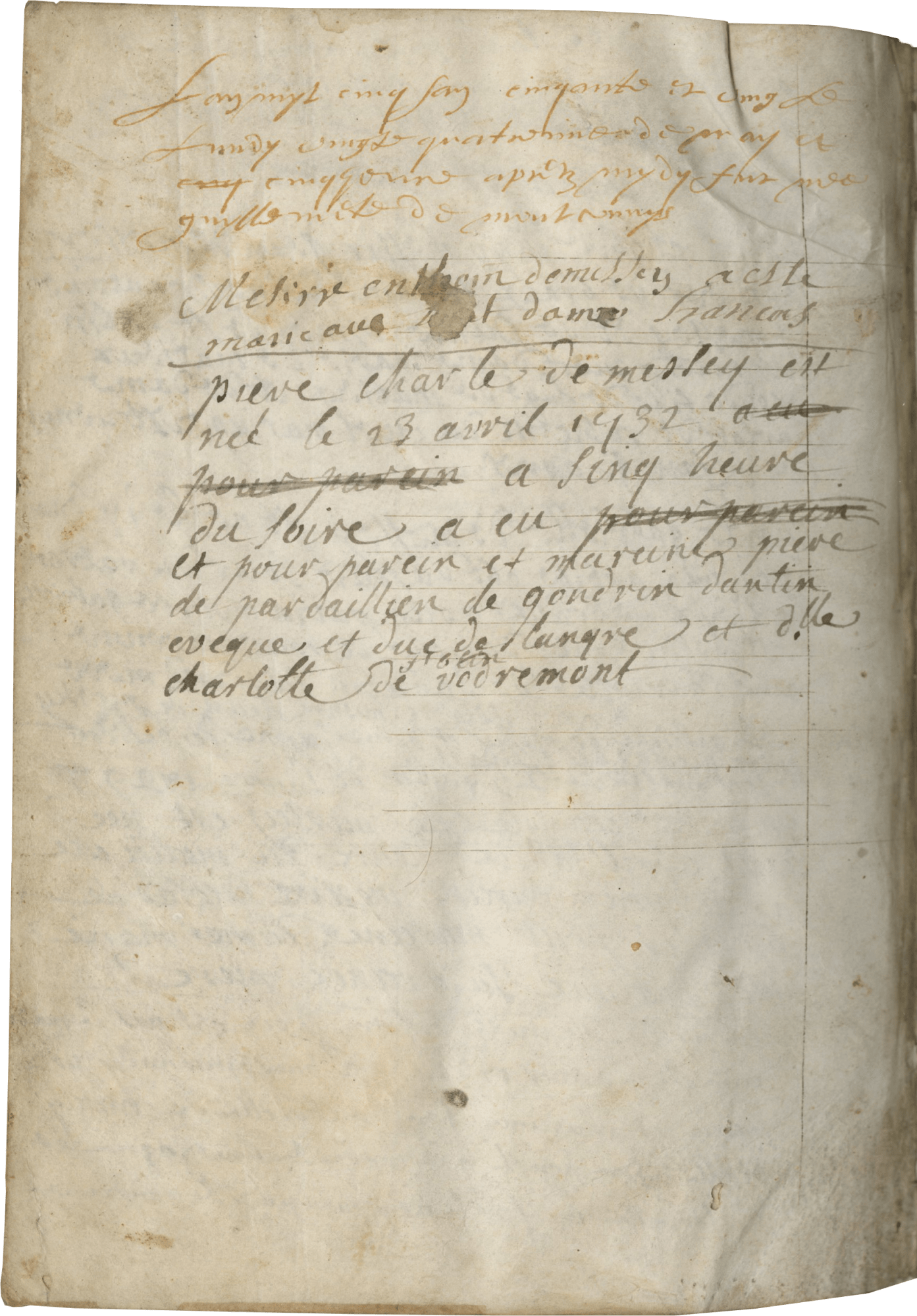 3. Georges de Saint-Belin (b. 1542), Lord of Biesles (Northeastern France, Champagne), who married in 1568, and by descent for two centuries, 1568 to 1731. The final leaves (ff. 107v-111v) were used as a livre de raison, recording the family’s births and marriages. The present manuscript passed to Anthoine de Messey, who married Anne de Saint-Belin in 1654, then to their eldest son Jan de Messey (b. 1655), who married in 1699, and then to his eldest son Charles Gabriel de Messey (b. 1701), who married in 1729, with the last mentions recording the births of his own children in 1730 and 1731.