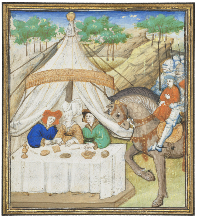 Jean Haincelin (Dunois Master), France, Paris, 1444? Lancelot Dines with a Knight and his Sweetheart, cutting from the Livre du Lancelot del Lac